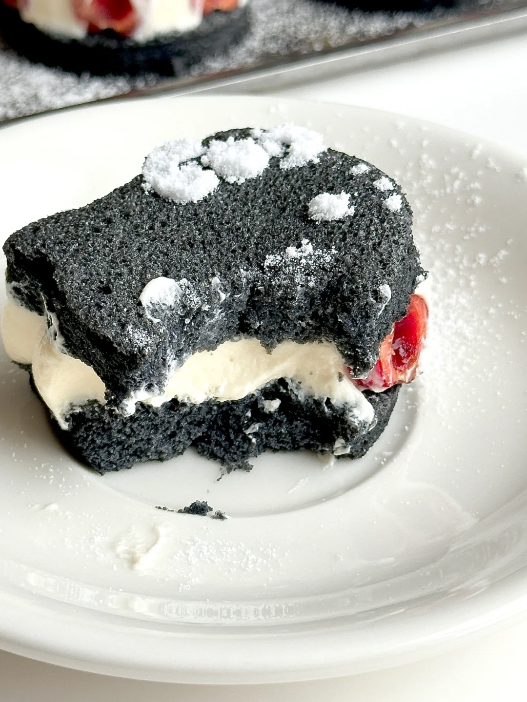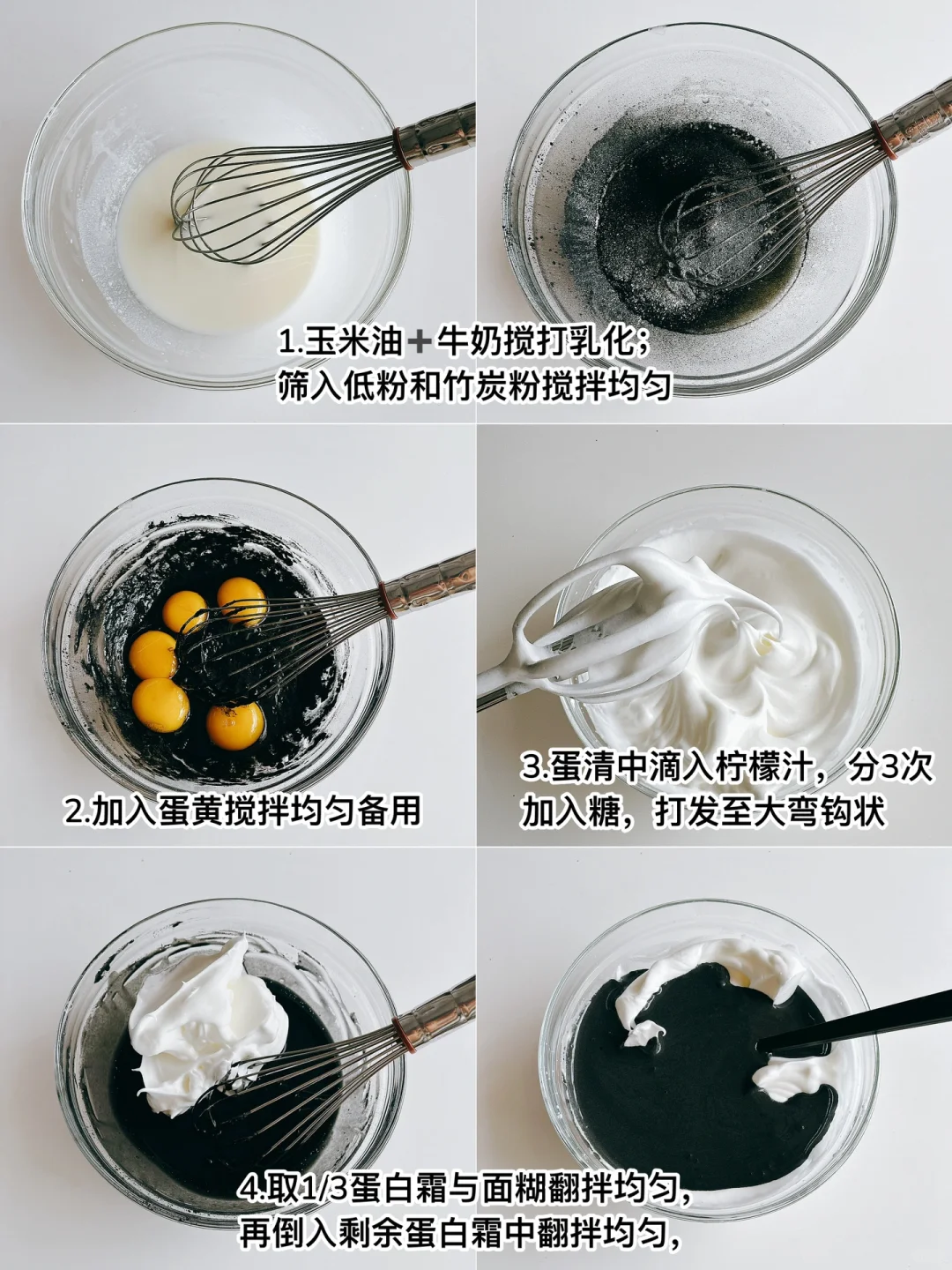 ❶玉米油➕牛奶🥛搅打乳化,筛入低粉和竹炭粉搅拌均匀,加入蛋黄搅拌均匀备用