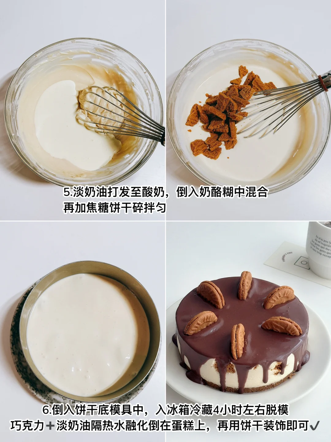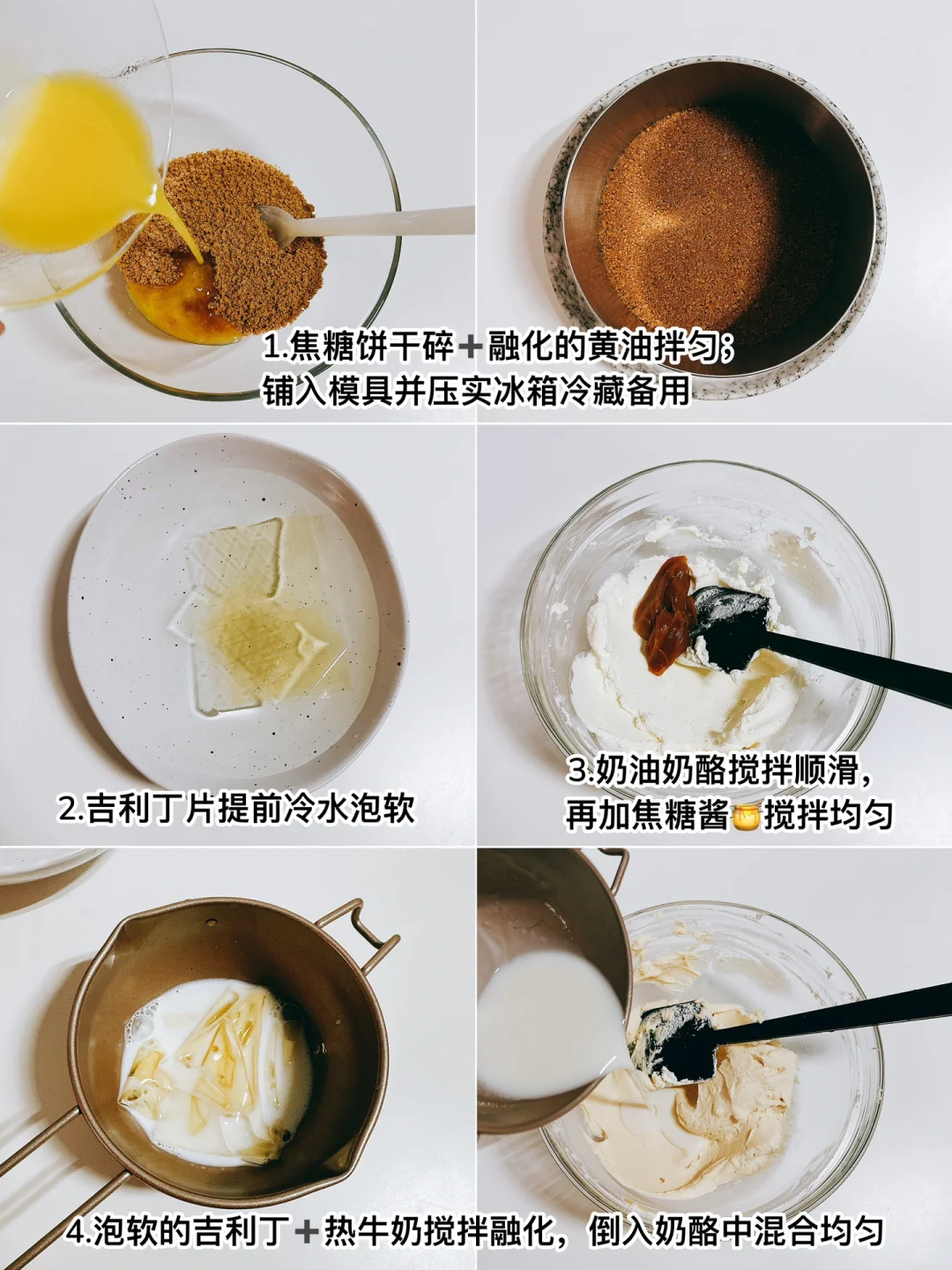❶焦糖饼干碎➕融化的黄油拌匀,压入模具冰箱冷藏备用