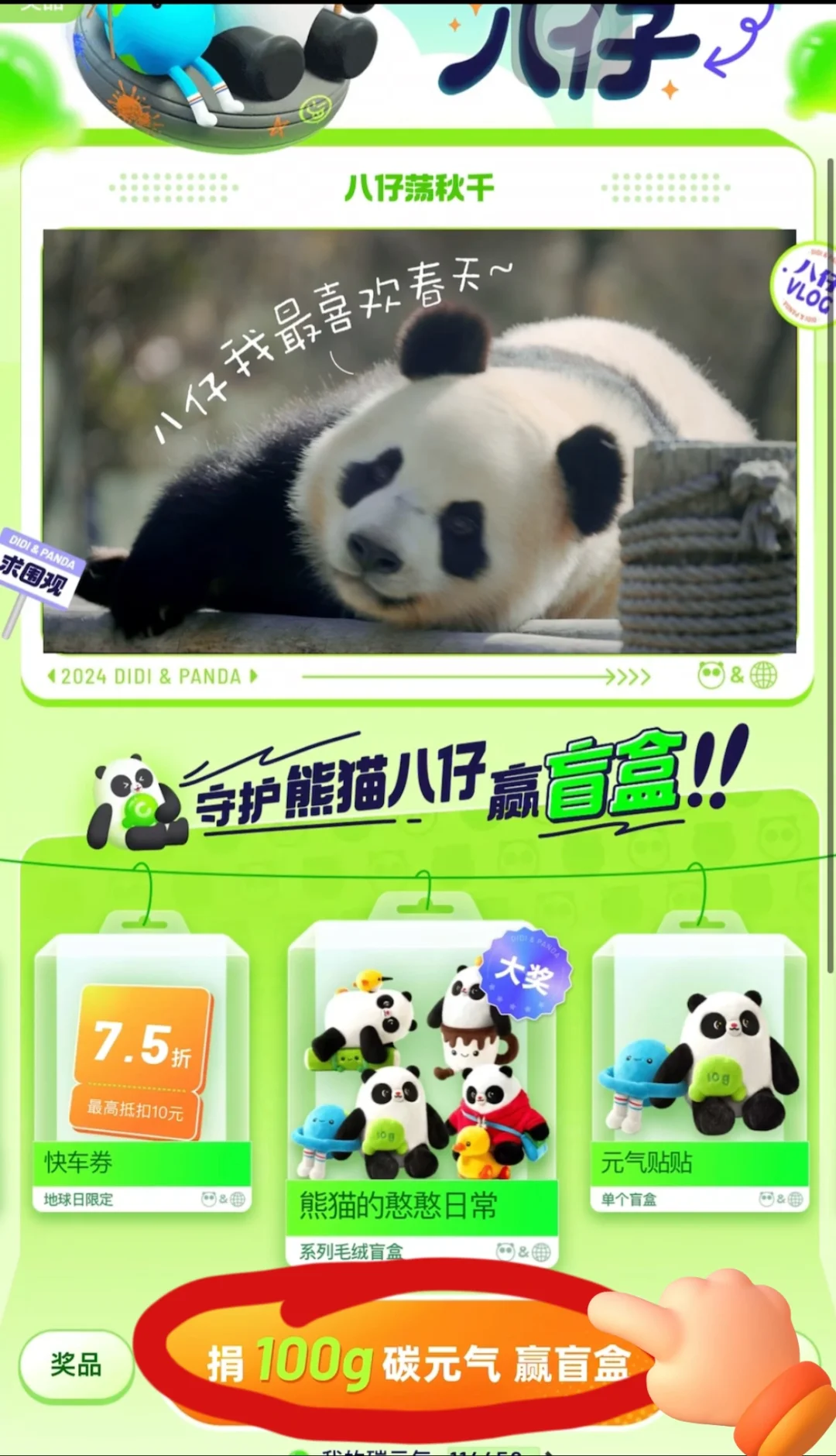 打工人每天都想发疯[抓狂R] 上班踩点到 下班滴滴打车走 绝不在公司多待一分钟[生气R] —— 我时常觉得我不应该在办公楼 如果在动物园 当一只国宝熊猫🐼该多幸福! 每天啃啃竹子🎋 露露脸 就上班完毕了 —— 最近刷到了大熊猫八仔 原来他就是大名鼎鼎的 棕色大熊猫七仔的儿子! 妈妈还是大美熊正正🐼 形象和气质这块拿捏的死死的! 光靠脸这辈子 饭碗就不愁了[皱眉R] —— 而且最近滴滴出行 终身守护熊猫八仔了 多么稳定的编制生活! 山东ip实名制羡慕了[皱眉R] 越搜八仔的照片越心动 越扒资料越可爱 实在手痒做了他一堆表情包[自拍R] —— 虽然不能人手一只大熊猫八仔🐼 但是可以用滴滴a.p.p 目的地🔍【守护八仔】 参与「一起云守护八仔」活动 [四R]月[二R][二R]日-[五R]月[五R]日 通过乘坐新能源车/拼车🚗等低碳出行 积碳元气 捐碳元气 就可获得「八仔守护证书」[清单R] 还有抽奖机会赢取可爱的熊猫盲盒! 我决定这个月 每天都打开滴滴低碳出行! 既可以守护熊猫 又可以有可爱的熊猫盲盒周边可以抽取 我先冲了![耶R]