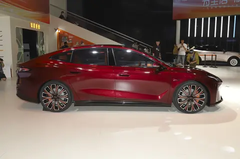 车身尺寸方面,其长宽高分别为4920*1920*1475毫米,轴距为2900毫米,相较于比亚迪秦L(轴距2820毫米)更具优势,这也意味着车内将拥有更为宽敞的乘坐空间,后排乘客的腿部活动空间尤为充裕。车身侧面线条流畅修长,溜背式轿跑造型从车头延伸至车尾,配合隐藏式门把手与低风阻轮毂,有效降低风阻系数。车尾部分呢,贯穿式尾灯与前脸形成呼应,两侧还有着竖直的尾灯组,看起来更为帅气。