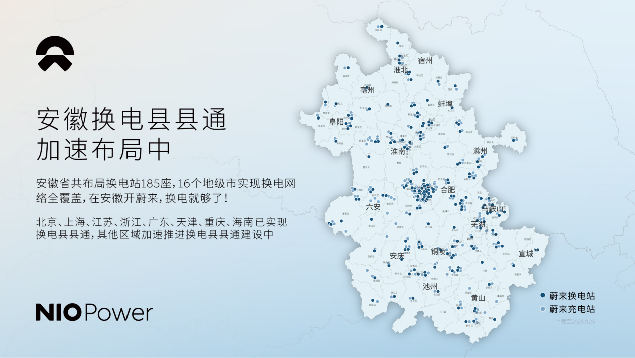截至目前,安徽区域已上线蔚来换电站185座,超充站208座,1,188根,接入第三方充电桩42,640根。