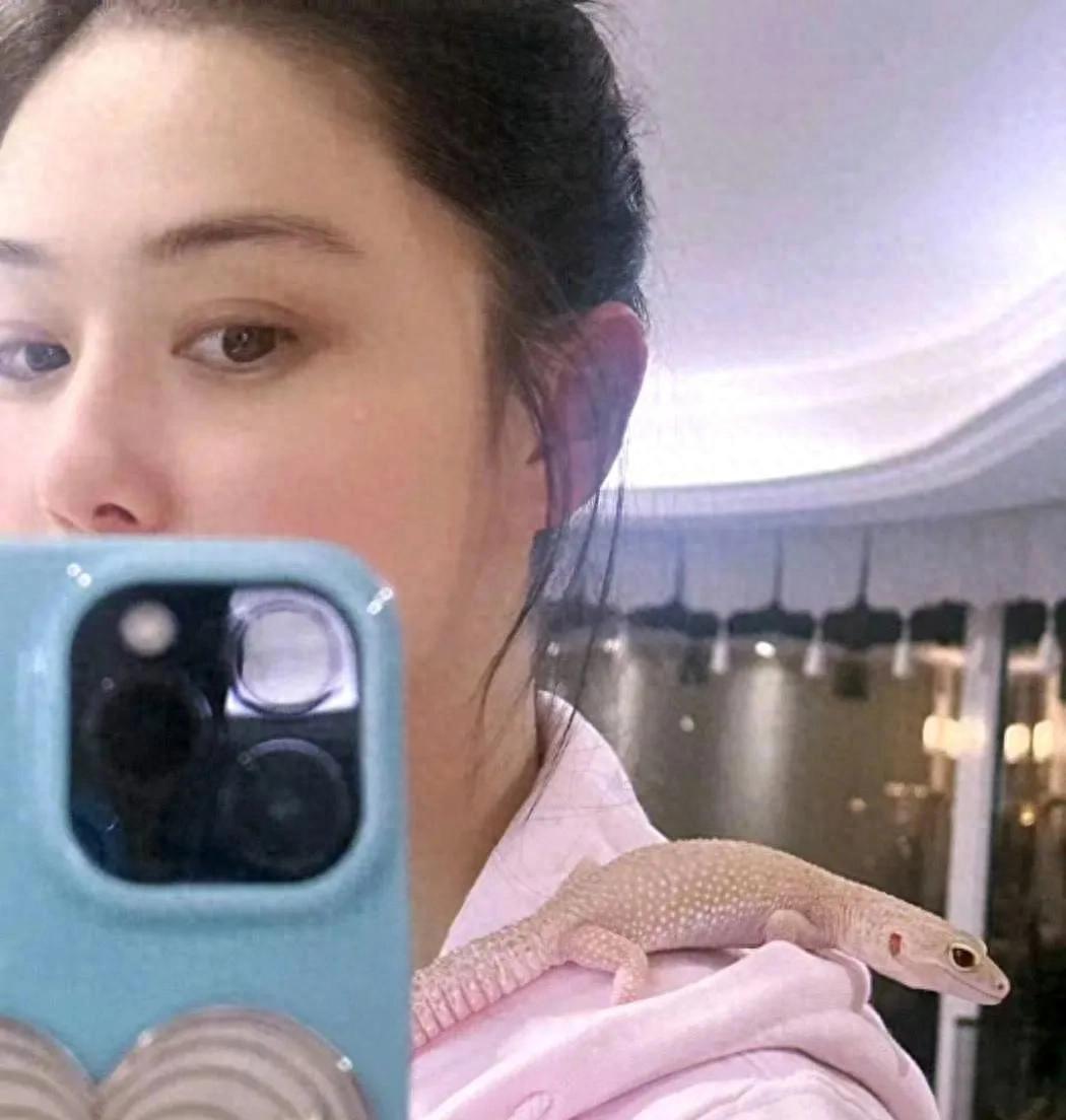 而最引人注目的,莫过于她胸前的蜥蜴玩具。这两只蜥蜴并非普通的模样,形态各异,却都栩栩如生。它们不仅是装饰,更是她内心童趣的表达,成为她居家生活中的欢乐伙伴。或许在西藏之旅中,她邂逅了这些奇妙的生物,被它们独特的魅力所吸引,于是带回这份纪念,让它们成为自己居家生活中的一部分。