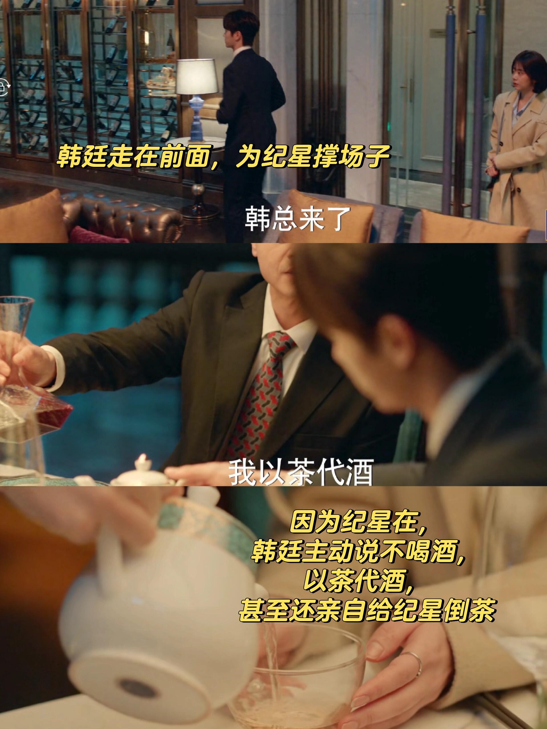 一坐下,韩廷就说不喝酒了,以茶代酒,甚至主动给纪星倒茶,很难不让人觉得是因为纪星在,不想让纪星喝酒,就直接说是自己不喝,其他人也不会再劝纪星喝酒,好高明!