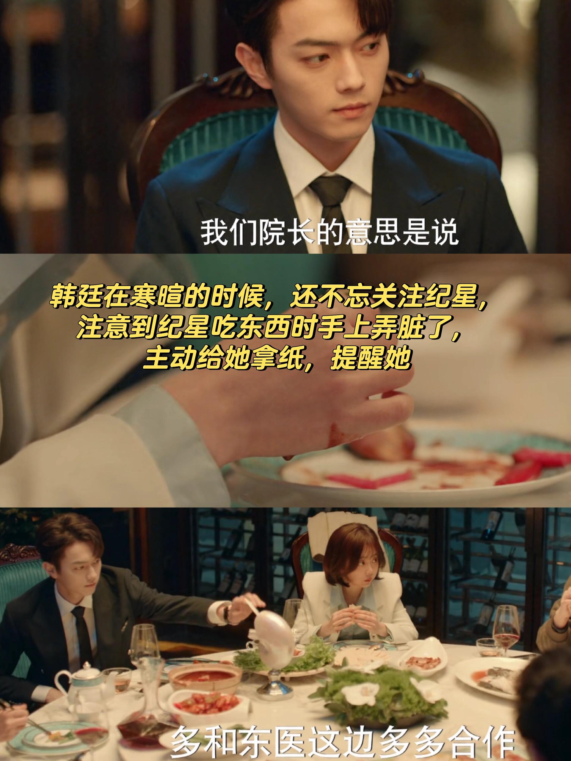 韩廷在寒暄的时候,还不忘关注纪星,注意到她吃东西弄脏了手,还提醒她,给她拿纸巾,这是在让她注意餐桌礼仪吧,太细心了!