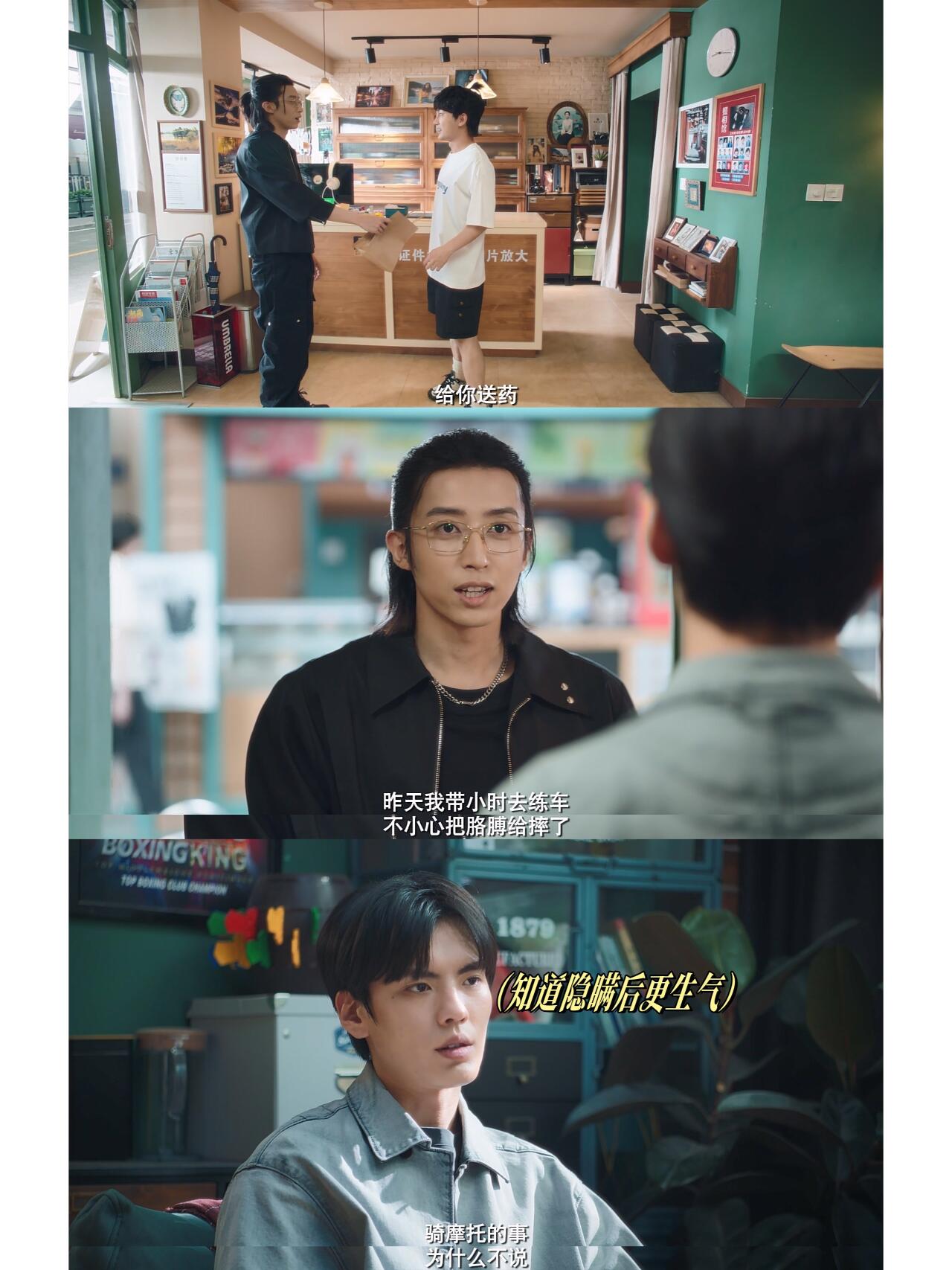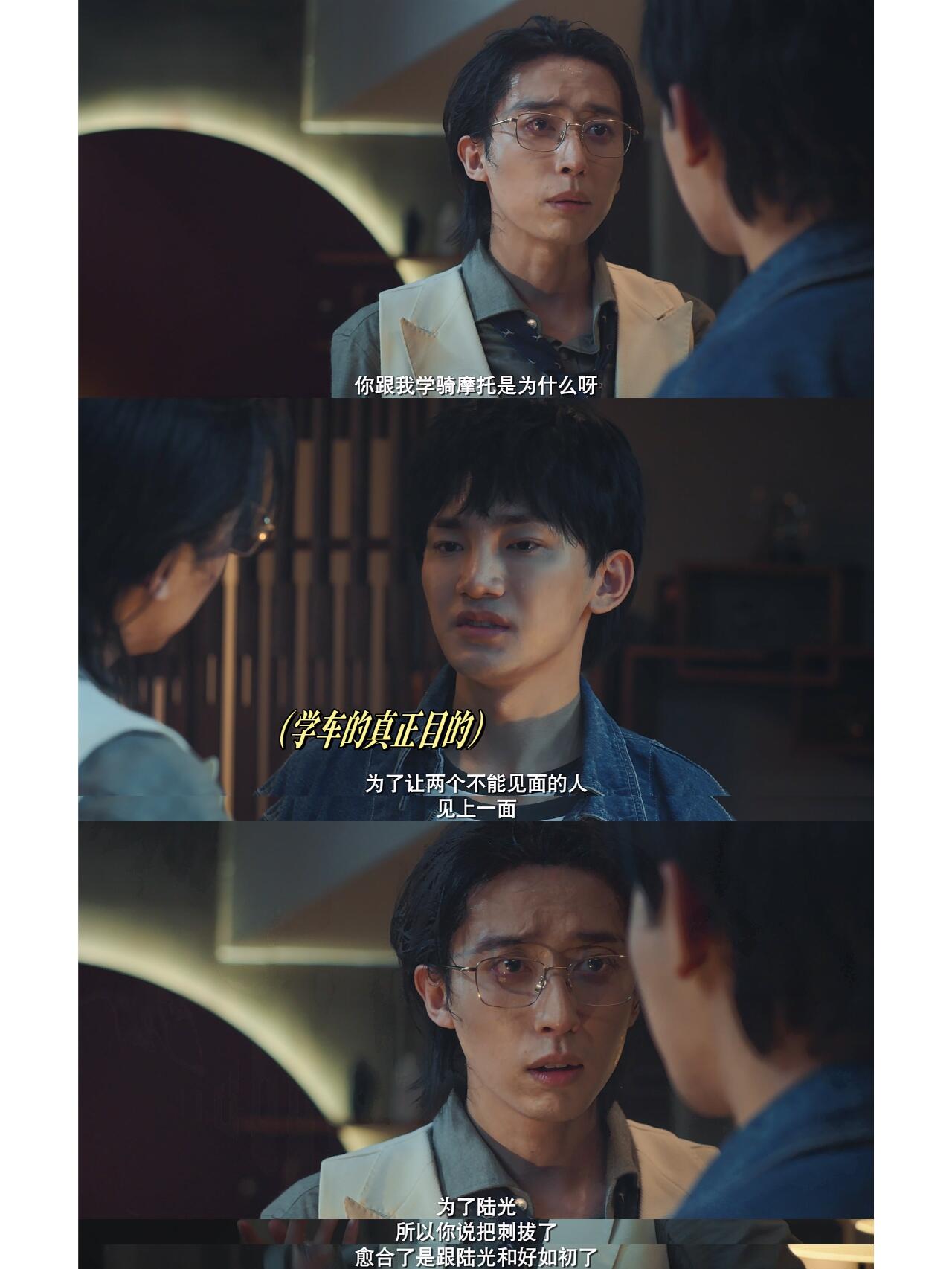 🔺昆曲单元开始的时候,程小时第一次拒绝和陆光一起出差,以为他是什么要紧的事儿,结果他居然是找何煦学骑摩托车,练车手受伤了还遮遮掩掩单手吃饭不敢让陆光知道,何煦上门送药,陆光那个眼神哟,又酸又心疼,但其实他不知道,小时是因为他一句话才去学的摩托!