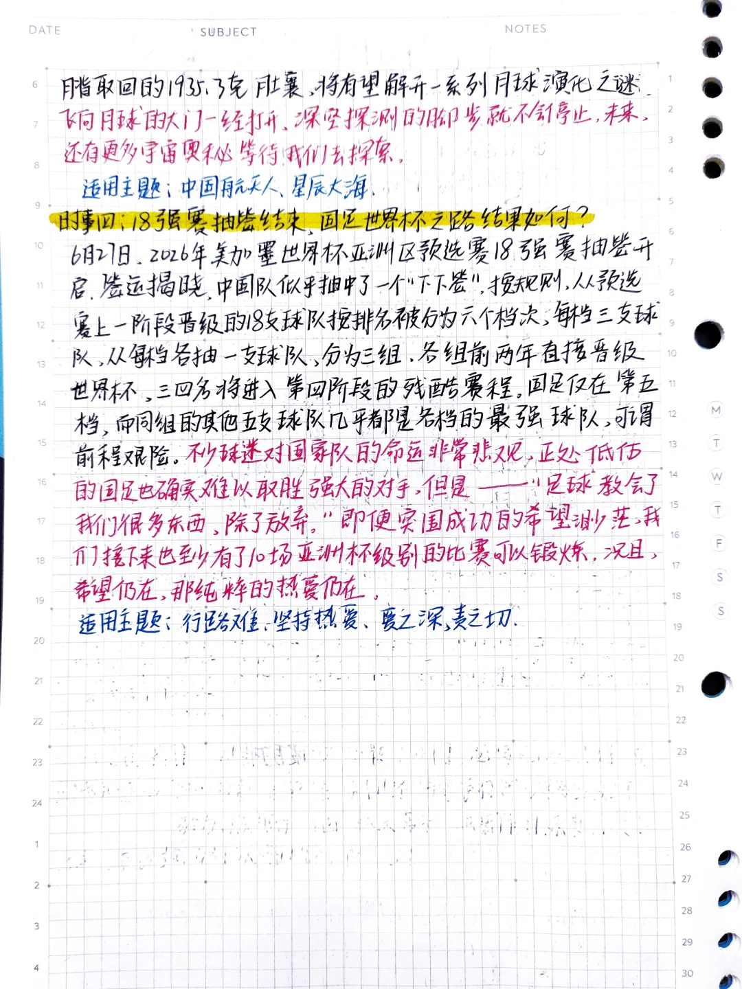 🎬这是6🈷️份第④篇时事素材 请公主们👸查收‼️ ✅时事一:邓稼先百年诞辰一国士无双 适用主题:少年强,则国强、年少立志、眺望未来 ✅时事二:即便家境优渥,也要足够努力 适用主题:力才是最应依赖的、努力的人都应被点赞 ✅时事三:嫦娥六号探月归来 适用主题:中国航天人、星辰大海 ✅时事四:18强赛抽签结束,国足世界杯之路结果如何? 适用主题:行路难、坚持热爱、 爱之深,责之切 ⛱素材来源:疯狂作文
