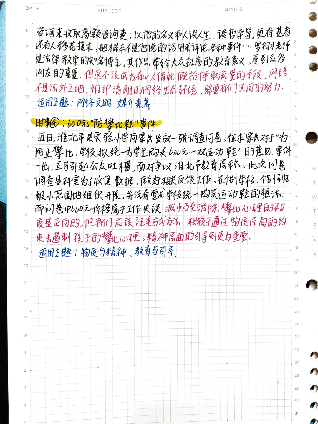 遇事不决搞学习 什么值得学 💭我今天又来更新大家zui想看的时事素材来 今天的更❤️的是5🈷️时事热点集②喔 别忘记摘抄①啦 ⛰时事①:峨眉山骡子驮重物引争议,每个生命都应被尊重 适用主题:平等与尊重、人与动物 ⛰时事②:警惕赵菊英式家庭教育,让教育回归本义 适用主题:教育观念、家庭教育、尊重 ⛰时事③:罗翔称被假冒发言,网络不是法外之地 适用主题:网络文明、媒介素养 ⛰时事④:600r“防攀比鞋”事件 适用主题:物质与精神、教育与引导 素材来源:疯狂作文