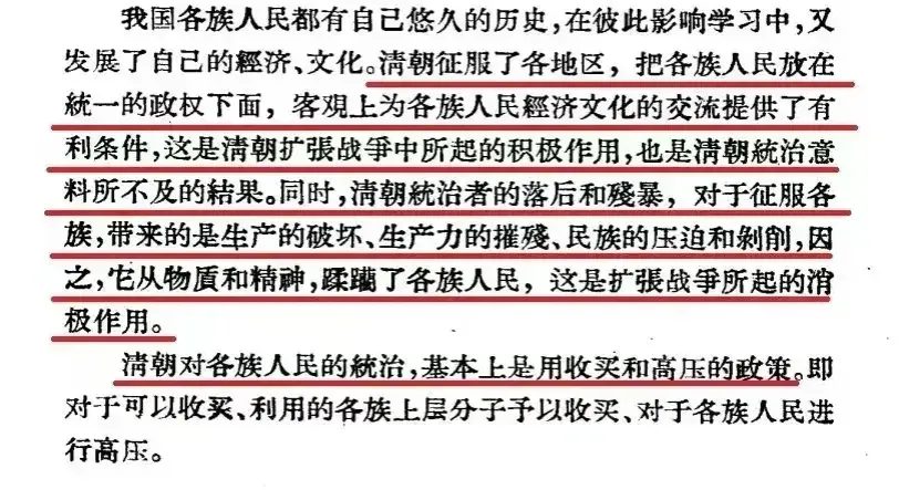 当时对清朝政权的定义是,以满清贵族阶级为主的,各族统治阶级的联合政权。该教材直言不讳的指出,各族人民陷入进了长达200多年的黑暗。