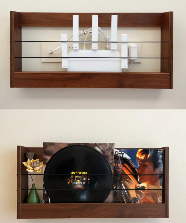 再把路由器放在架子上,外面放点好看的卡片、杂志,简单装饰一下,好看又实用。