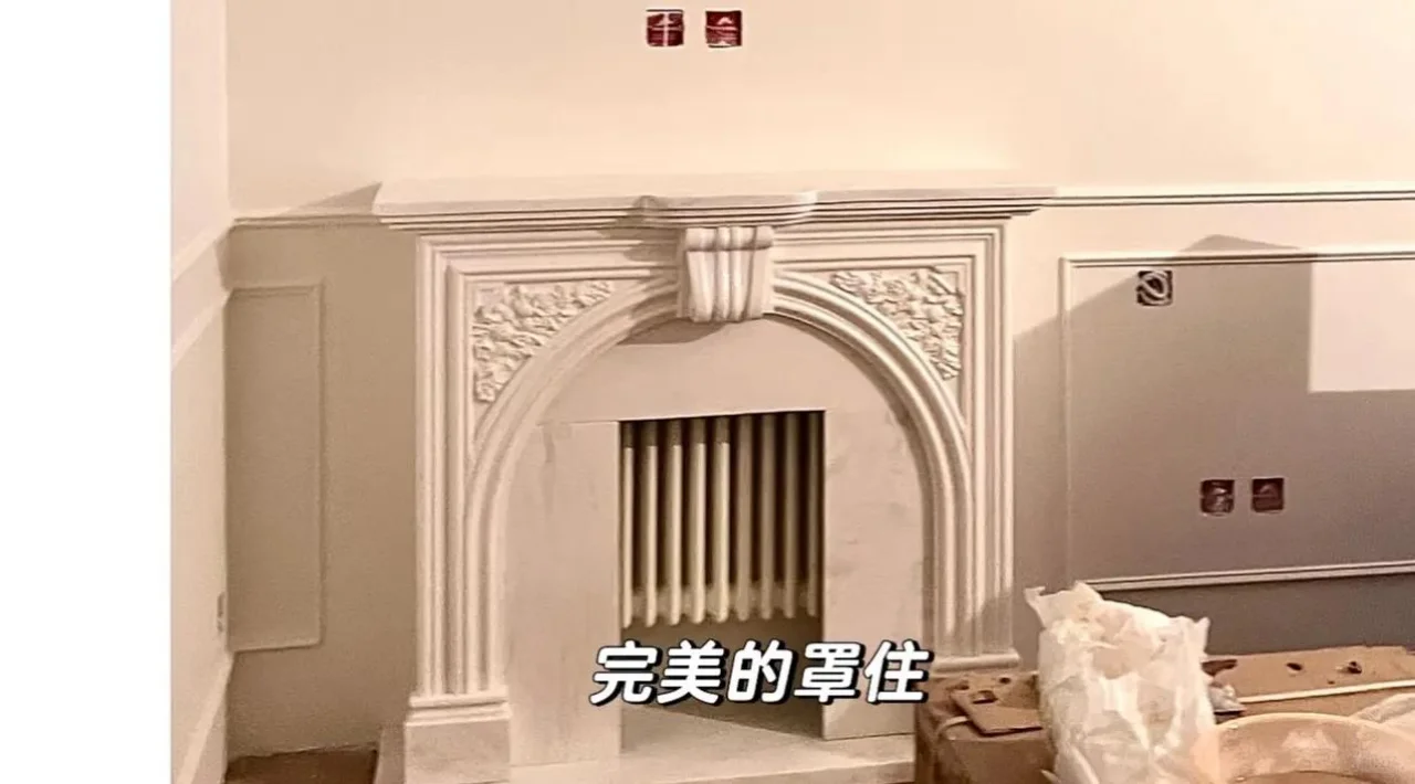 只需要在网上买一个假的壁炉,把它放在暖气前面,就可以完美罩住了。