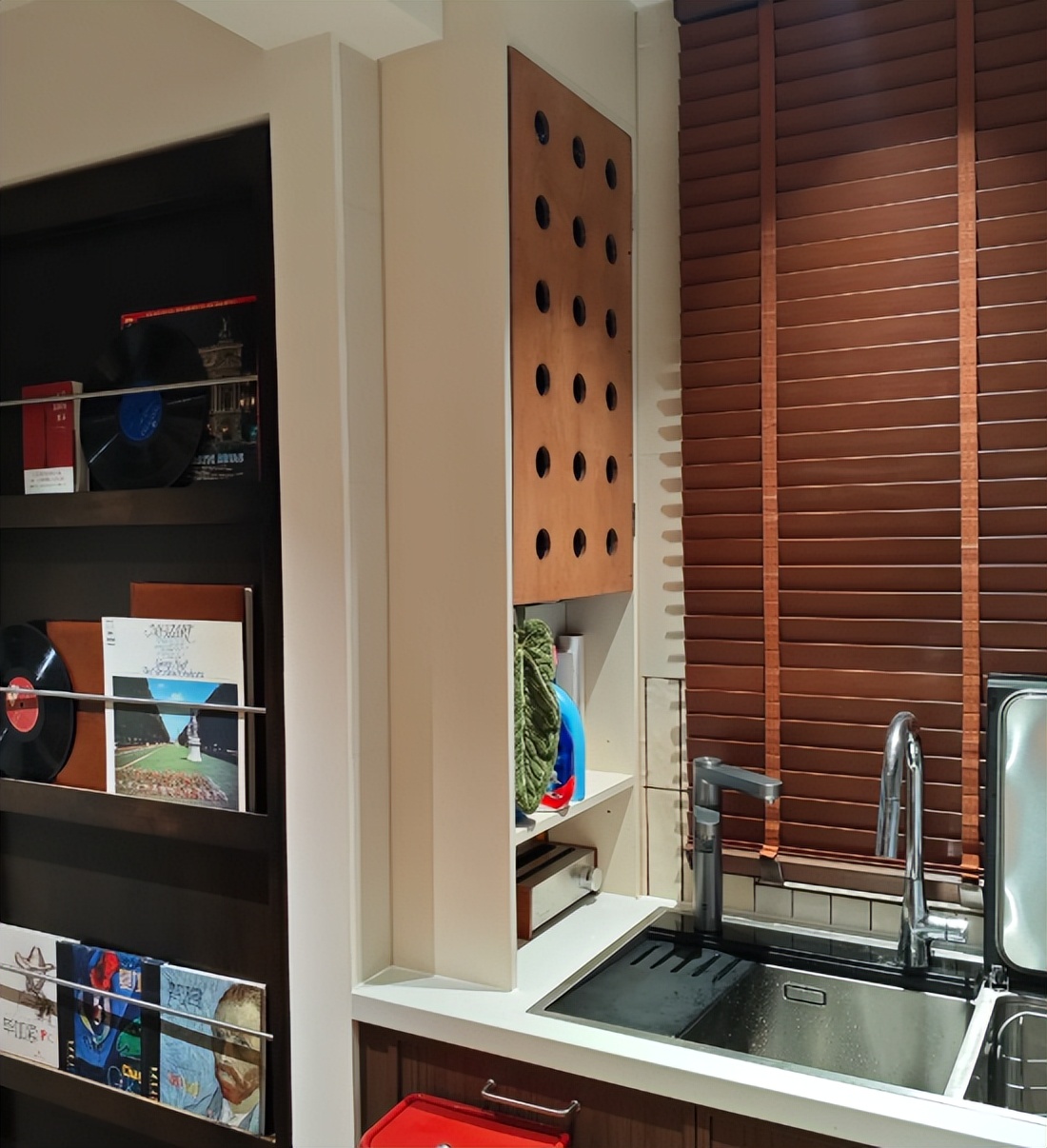 定制柜+中古洞洞门+管道遮挡罩,就可以把燃气热水器完美隐藏起来了。