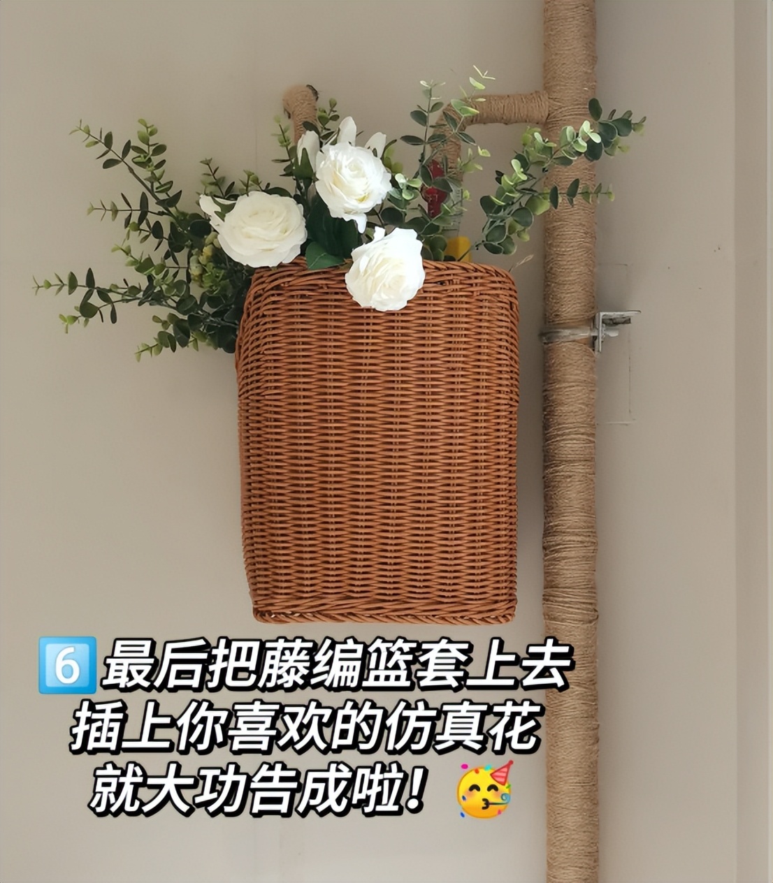 缠绕好了之后,就把藤编花篮挂在燃气管上。