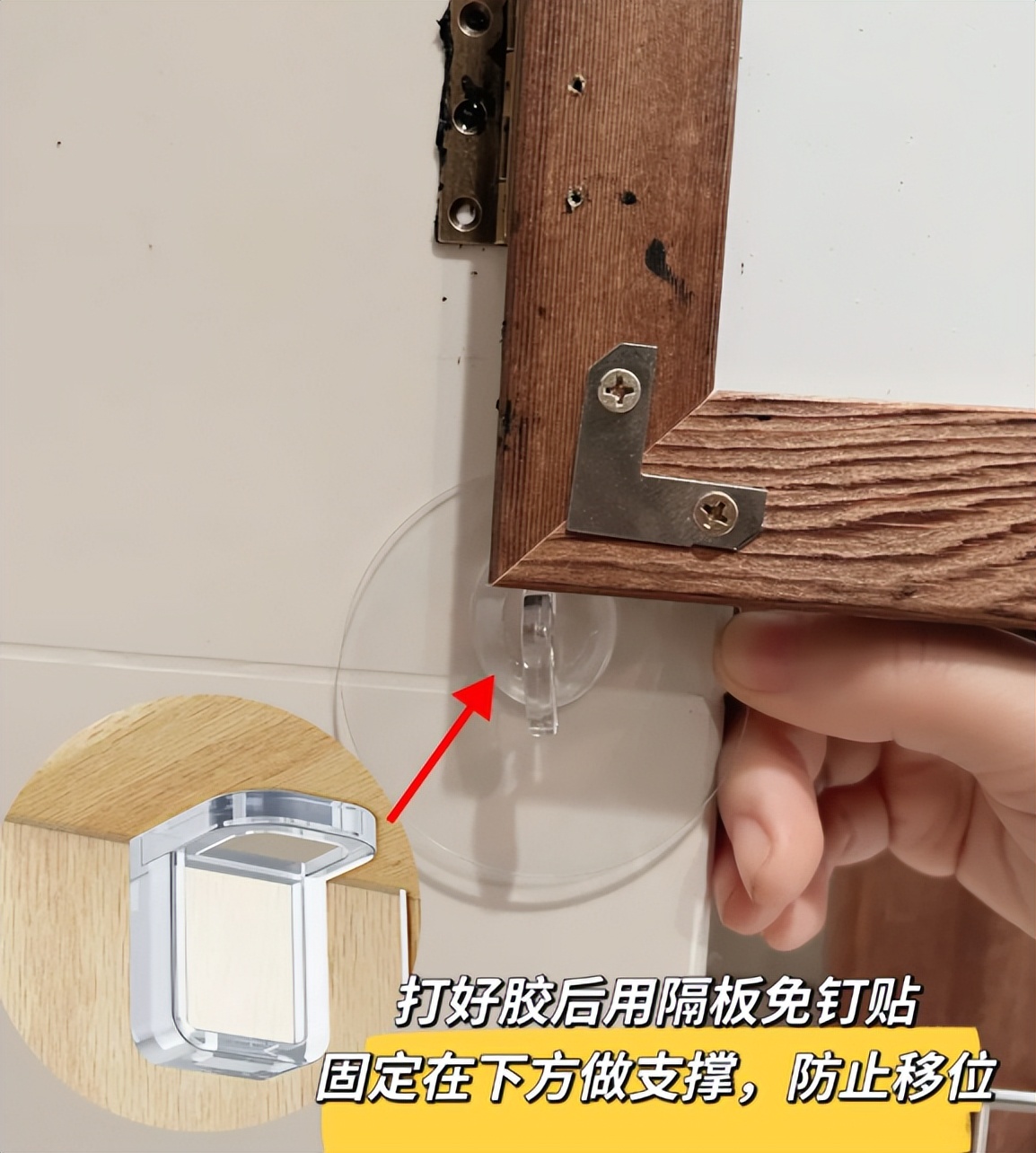打好胶之后,用这个隔板免钉贴固定在下方做一个支撑,避免木板移位。