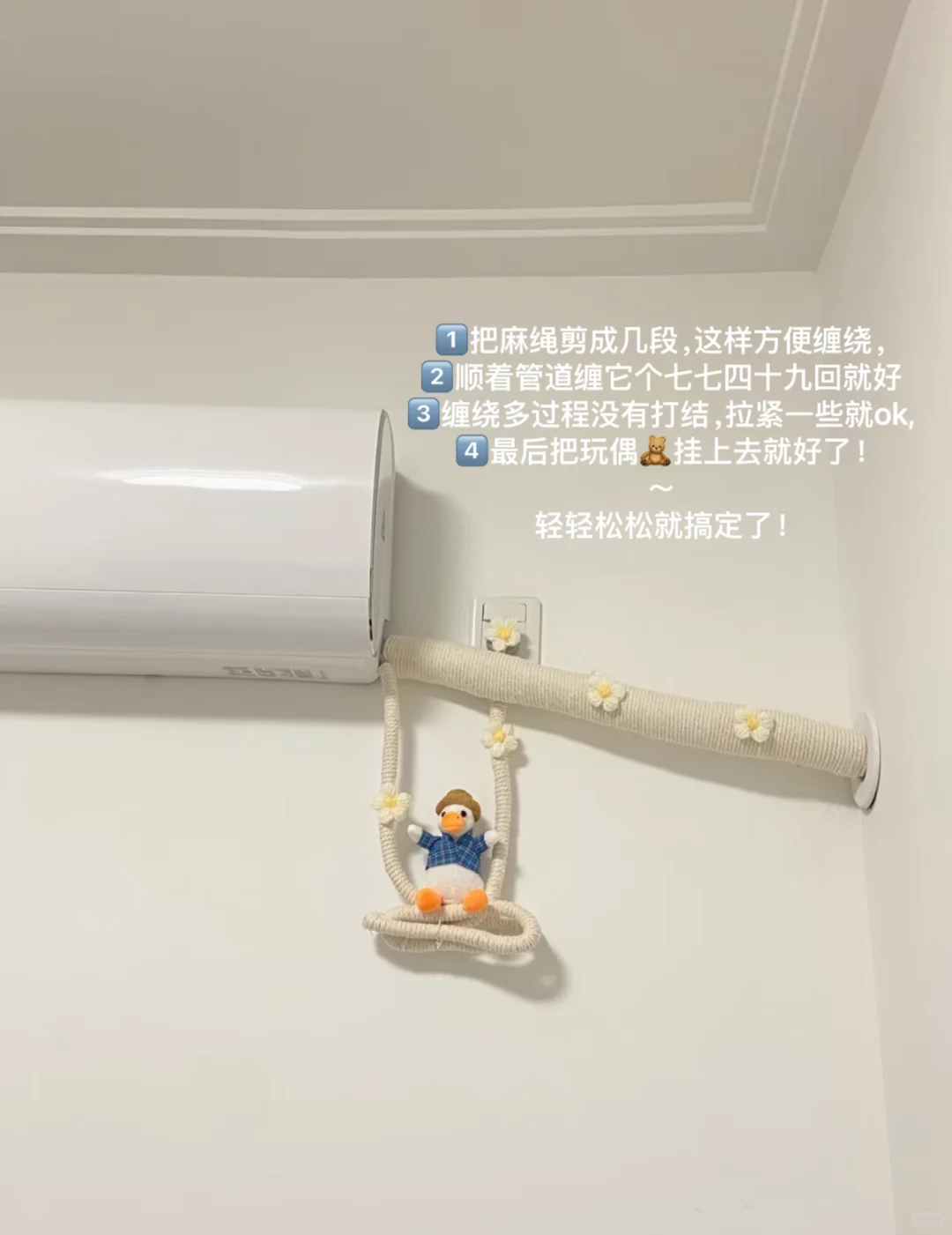 只需要准备一捆麻绳,把麻绳剪成几段,再把麻绳一圈圈缠绕在管道上,最后把玩偶挂上去,轻轻松松搞定。