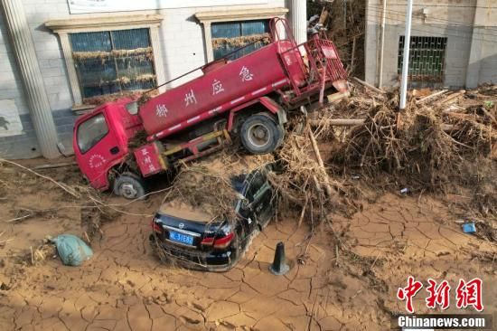 一辆汽车被山洪冲入湖南资兴市州门司镇一建筑物。