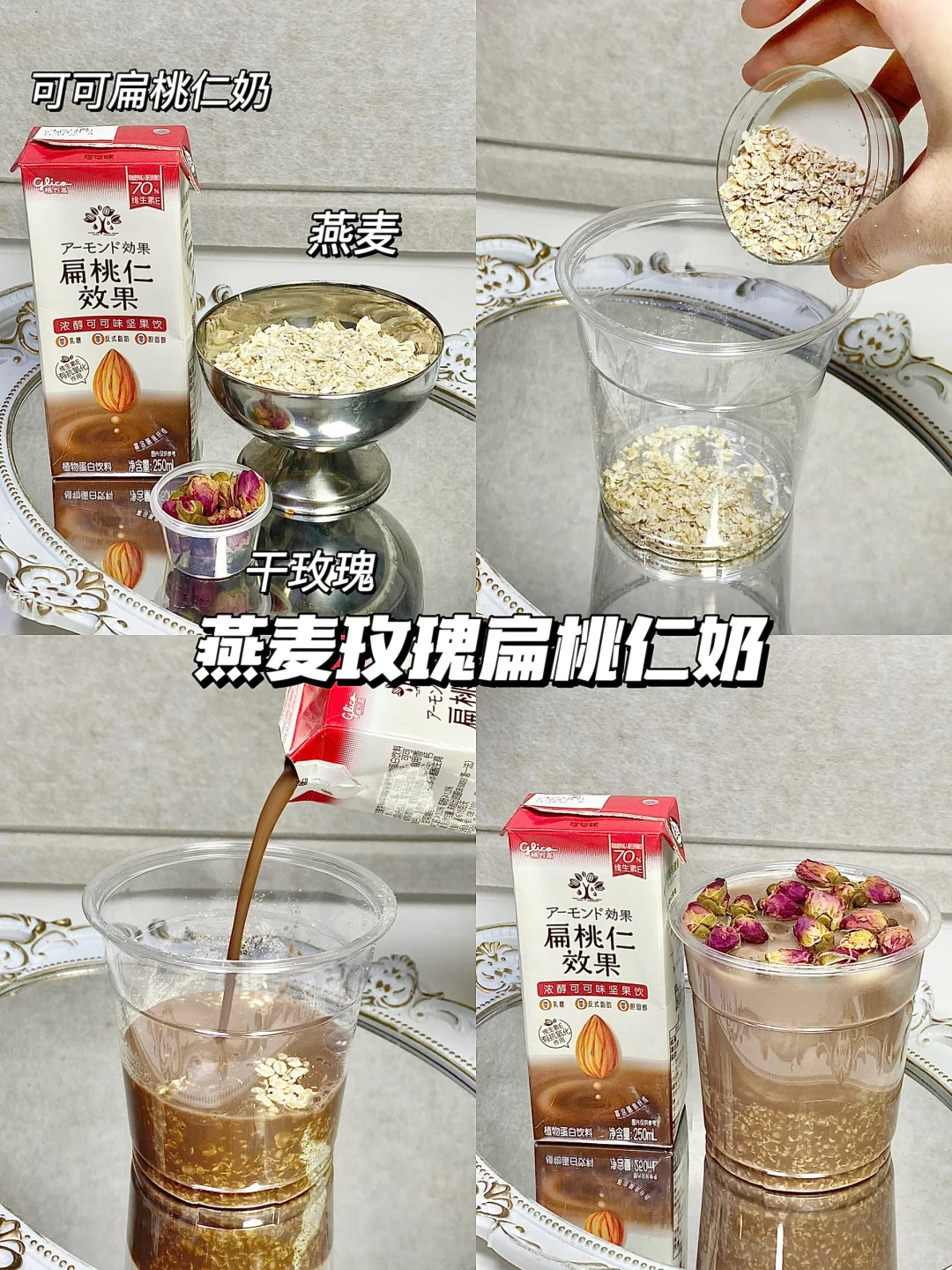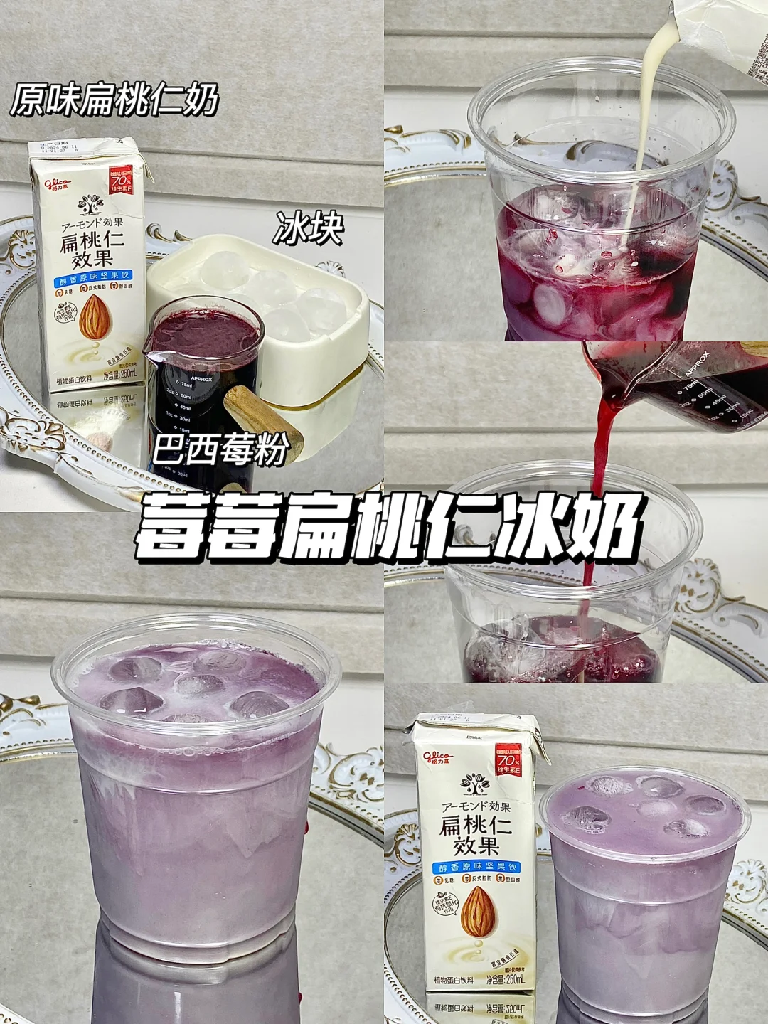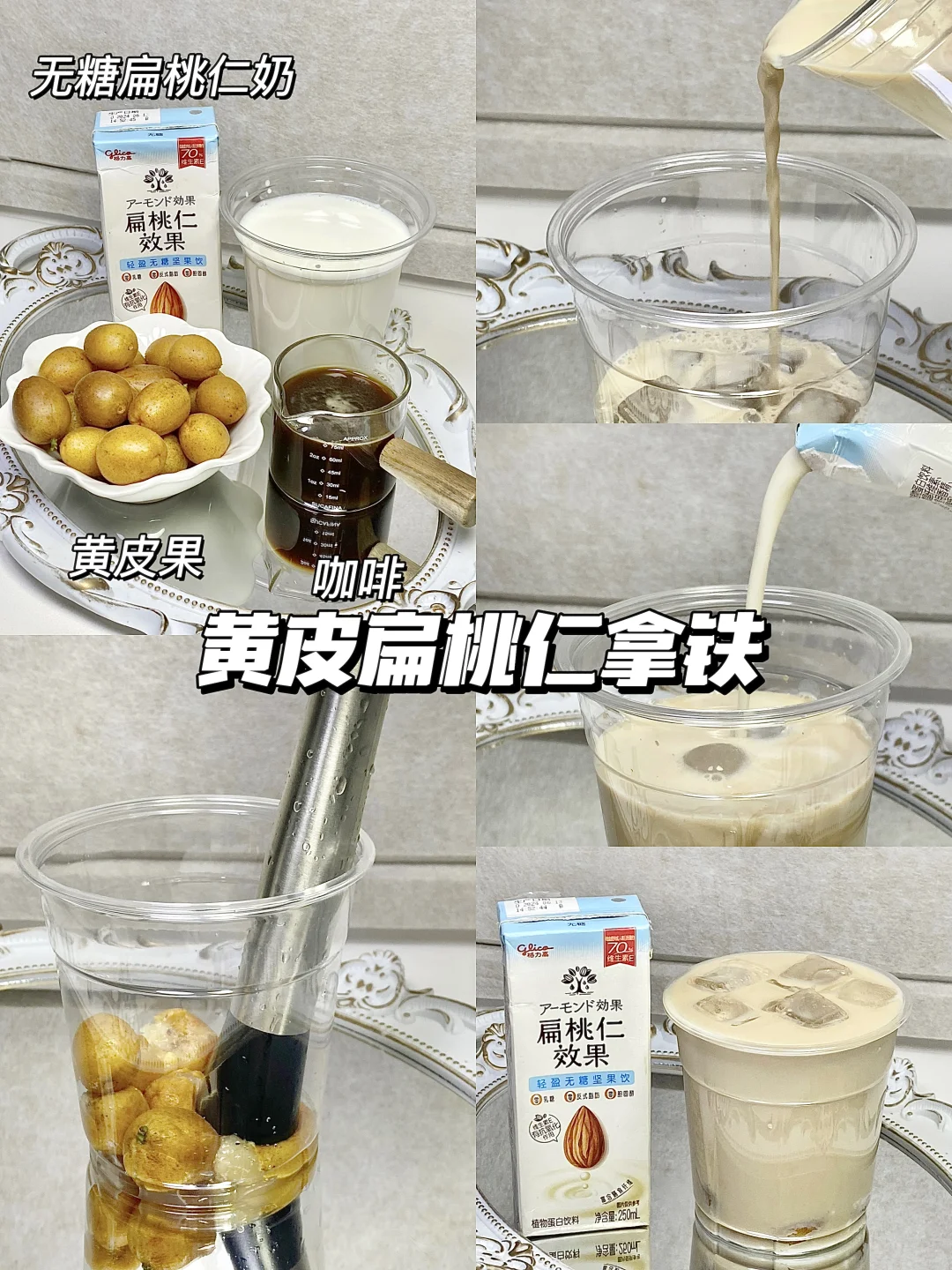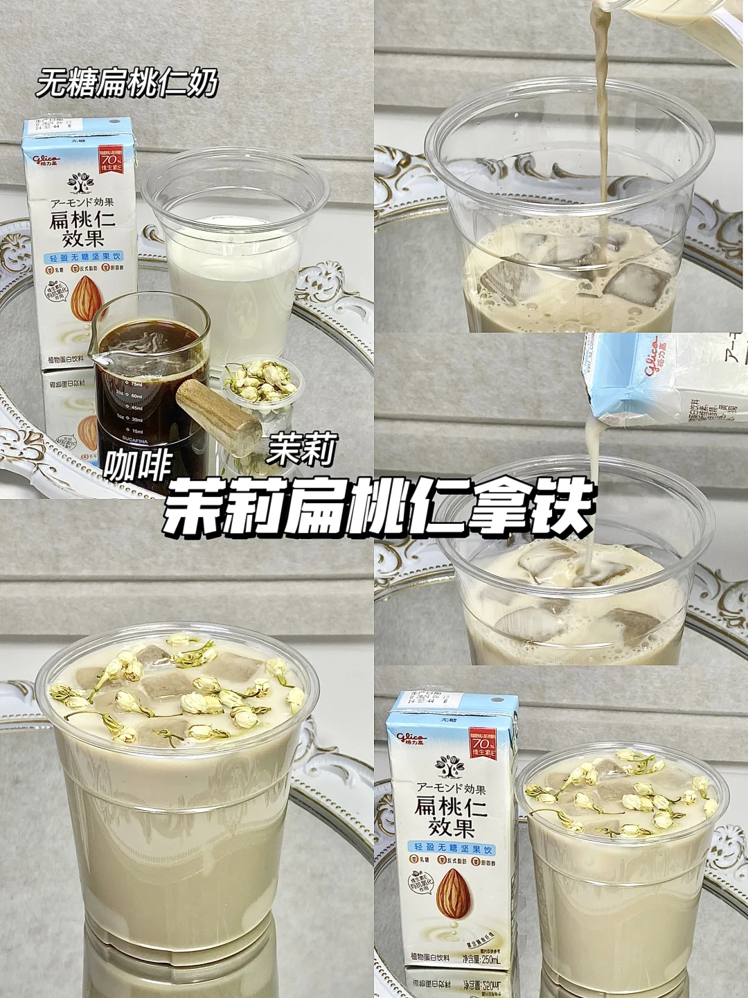 植物奶0乳糖,超级适合乳糖不耐,热量也更低。今天用到的是这个格力高扁桃仁奶(扁桃仁就是巴旦木),真的无限回购,超适合DIY饮品![赞R] 1⃣️黄皮扁桃仁拿铁 广东人应该不陌生黄皮果吧,酸酸甜甜的口感搭配扁桃仁奶,奶香味混合果味,真的巨巨好喝! 2⃣️燕麦玫瑰扁桃仁奶 燕麦➕玫瑰➕扁桃仁奶 早上来一杯太舒服啦,喝起来有淡淡的玫瑰味,燕麦吃起来也很有饱腹感!当早餐再合适不过了! 3⃣️茉莉扁桃仁拿铁 入口就能闻到茉莉的香气加上扁桃仁奶,茉莉花的香味奶香味咖啡的单单苦味混合得刚刚好,丝滑又好喝,无糖的喝起来毫无负罪感! 4⃣️莓莓扁桃仁冰奶 巴西莓粉➕扁桃仁奶➕冰块 这个颜色就很多巴胺,酸酸甜甜太好喝啦!!清爽又解腻 坚果奶真的好百搭,每款喝到嘴里都好丝滑!! 超级推荐无糖的,一点都不甜腻,也没有奶腥味! 0乳糖0胆固醇0反式的,好喝又健康! 而且扁桃仁的维生素E和膳食纤维含量真的高! 爱美的姐妹都知道!大牌护肤品都添加维生素E! 今天4款DIY饮品都很简单,可以一起试试哦[派对R]