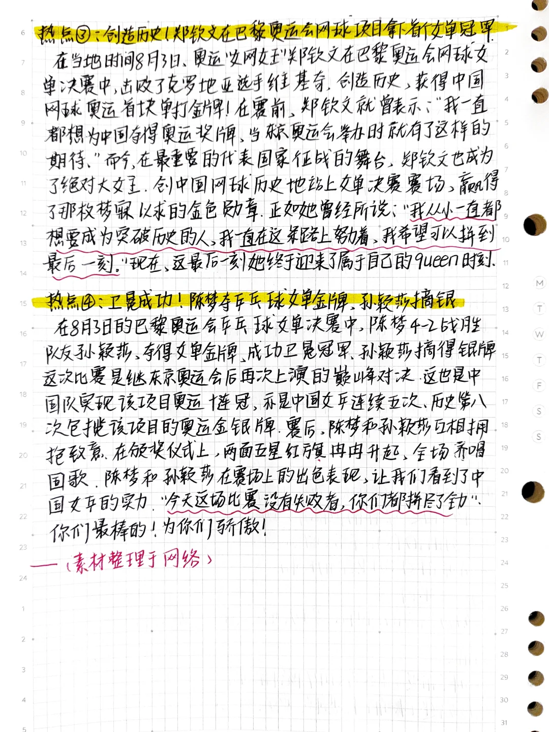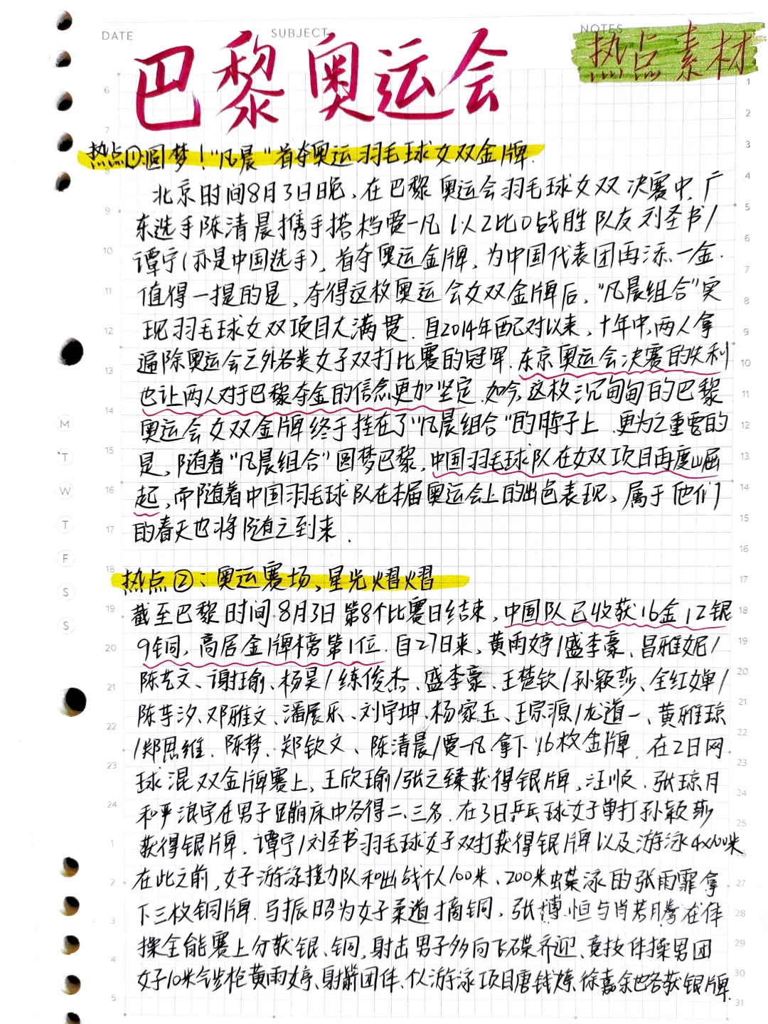 最新巴黎奥运会作文素材—4.0版本 ✅热点①:圆梦!“凡晨”shou夺奥运羽毛球女双金金牌🥇 ✅热点②:奥运赛场,星光熠熠 ✅热点③:创造历史,郑清文在巴黎奥运会网球项目拿下shou个女单冠军🏆 ✅热点④:卫冕成功!陈梦夺乒乓球女单金牌🥇,孙颖莎摘银🥈 ⛰(素材整理于网络)