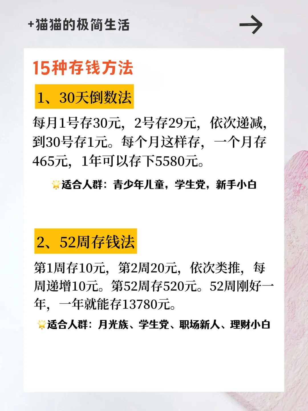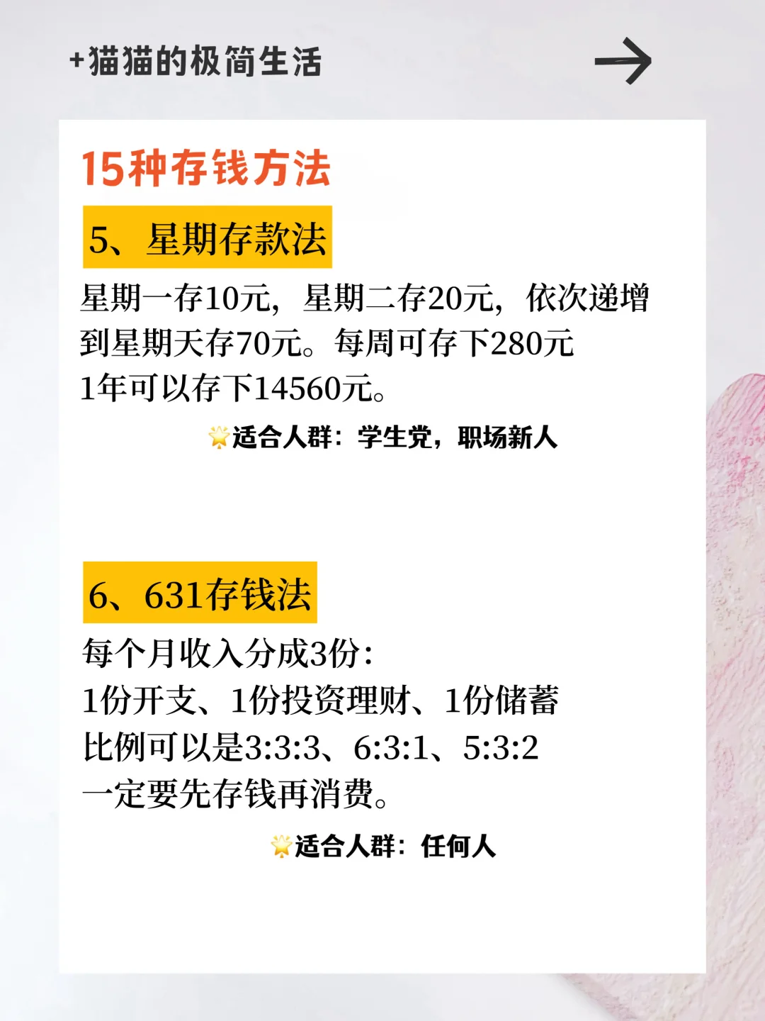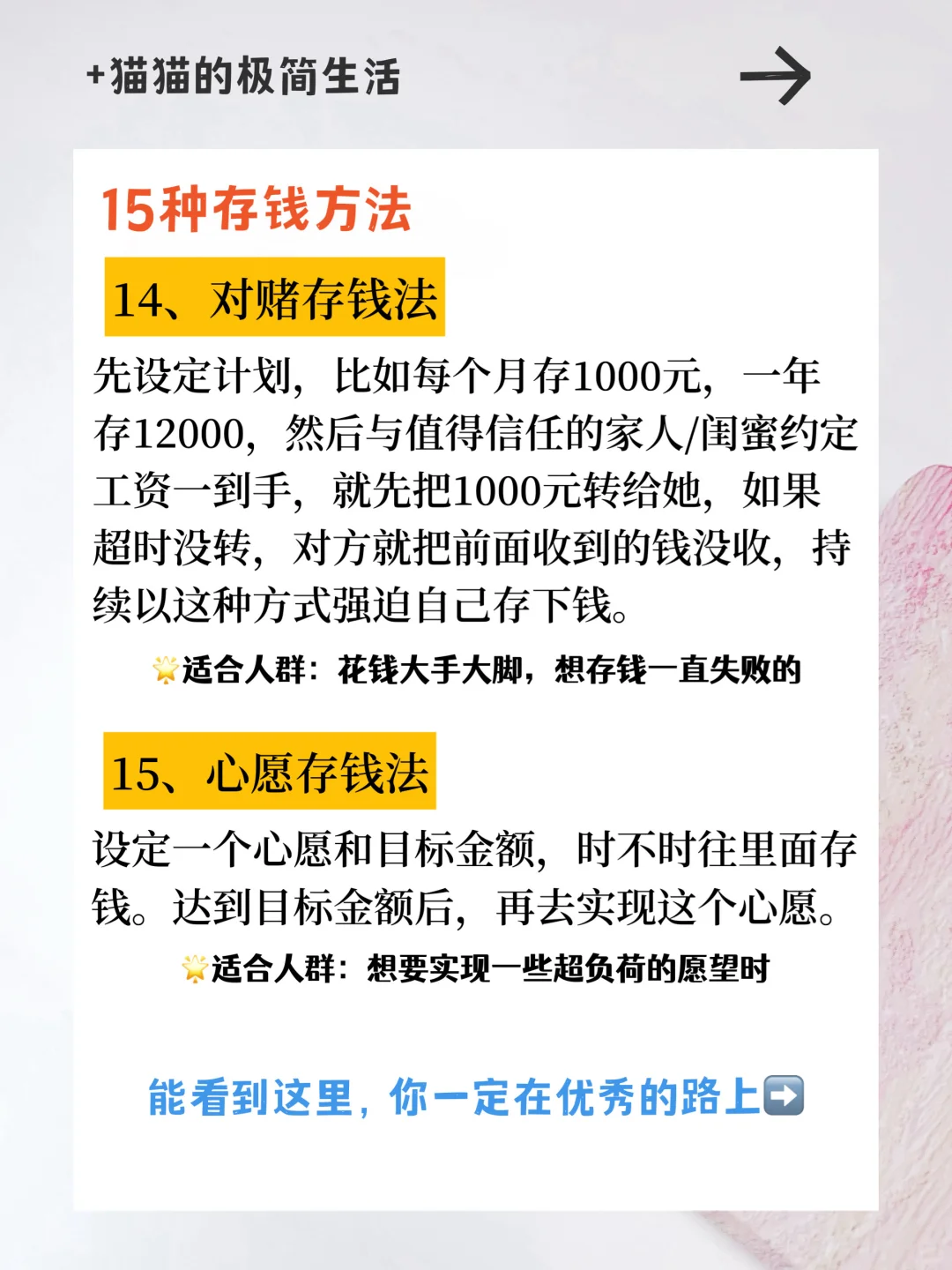 给大家汇总了全网最全的适合大众的15种存钱方法,快来看看最适合你的那种吧,get(收藏)起来,养成自己的储蓄方式