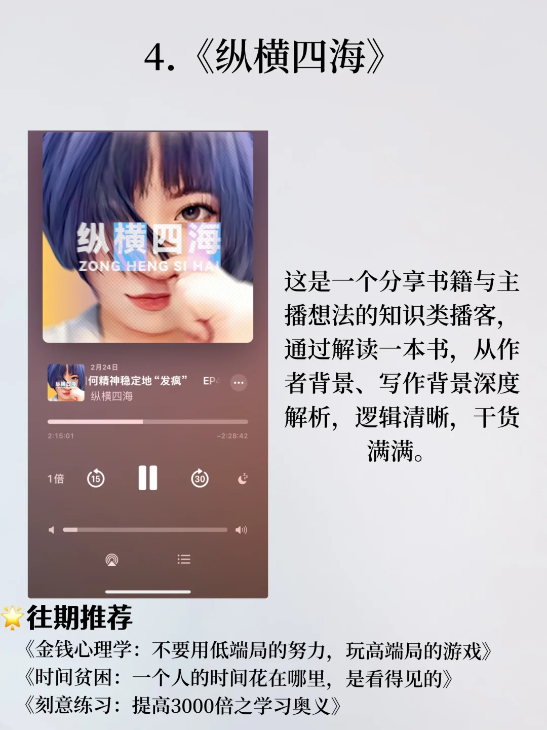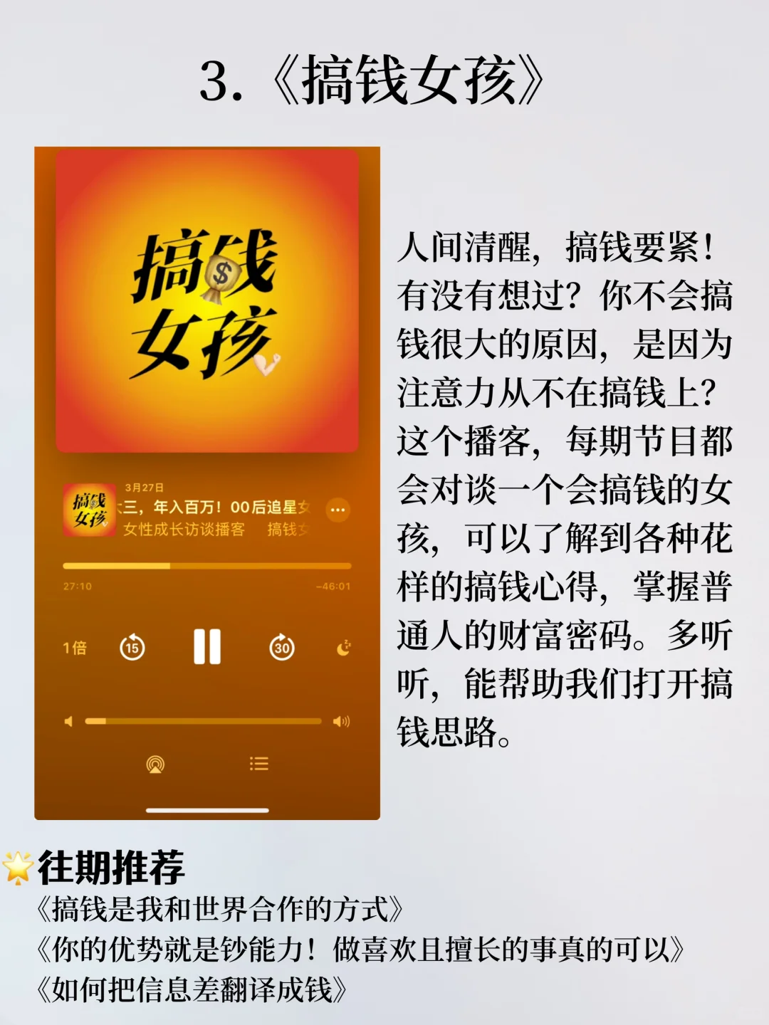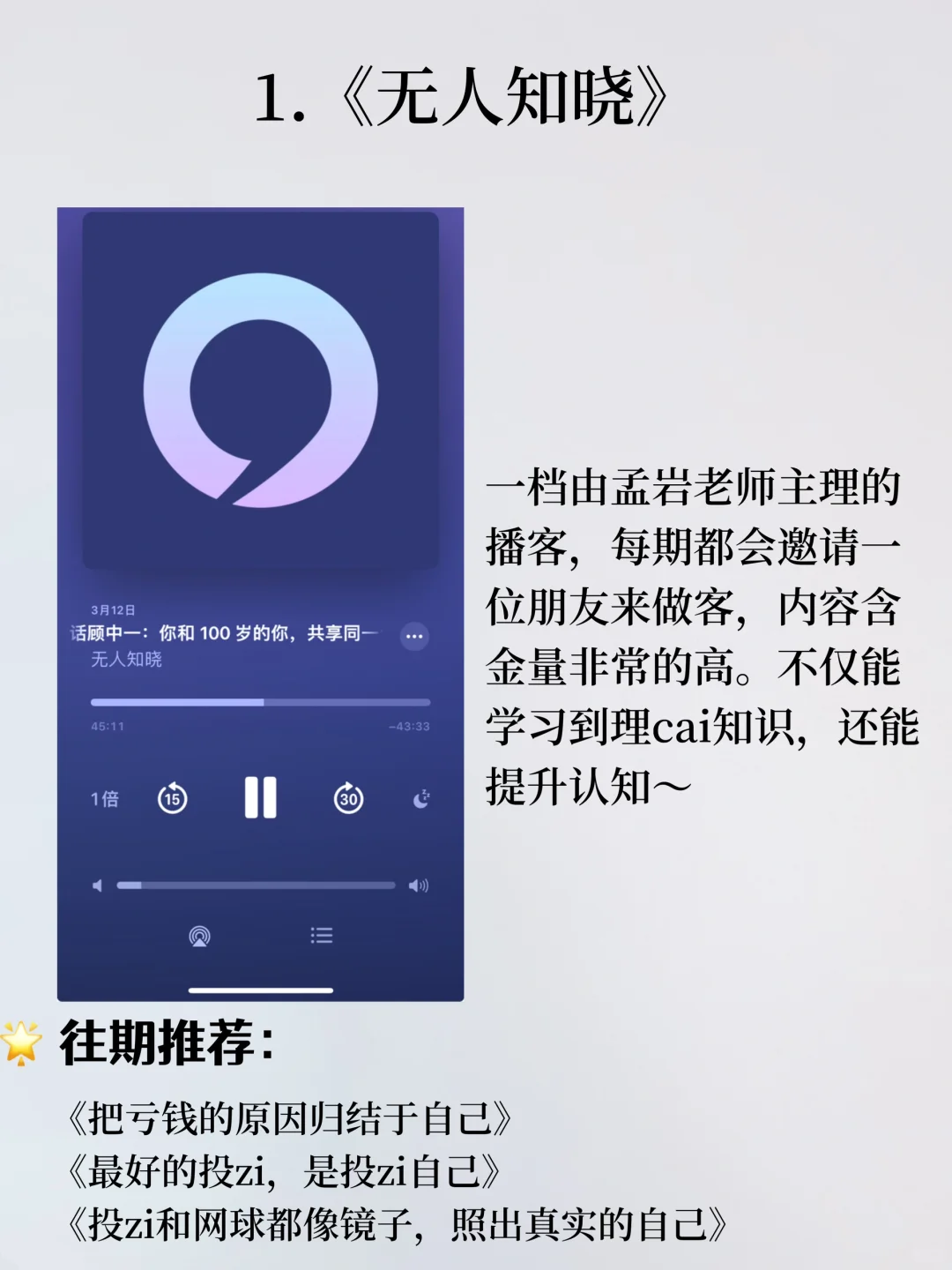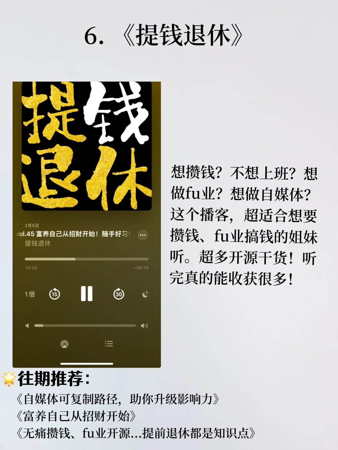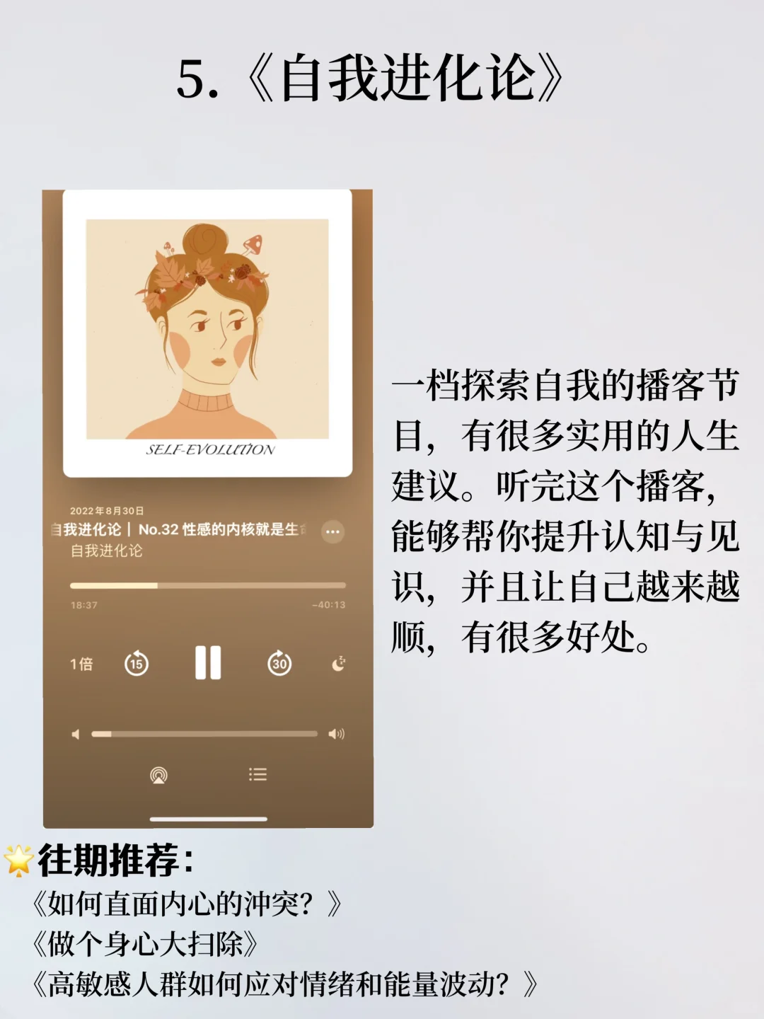 播客真的太好用了,我实在是太喜欢了,真心建议姐妹们空了都可以听听,会让人学习到很多新知识 今天分享6个我超喜欢的播客 1️⃣《无人知晓》 2️⃣《玄妙之门》 3️⃣《搞钱女孩》 4️⃣《纵横四海》 5️⃣《自我进化论》 6️⃣《提钱退休》
