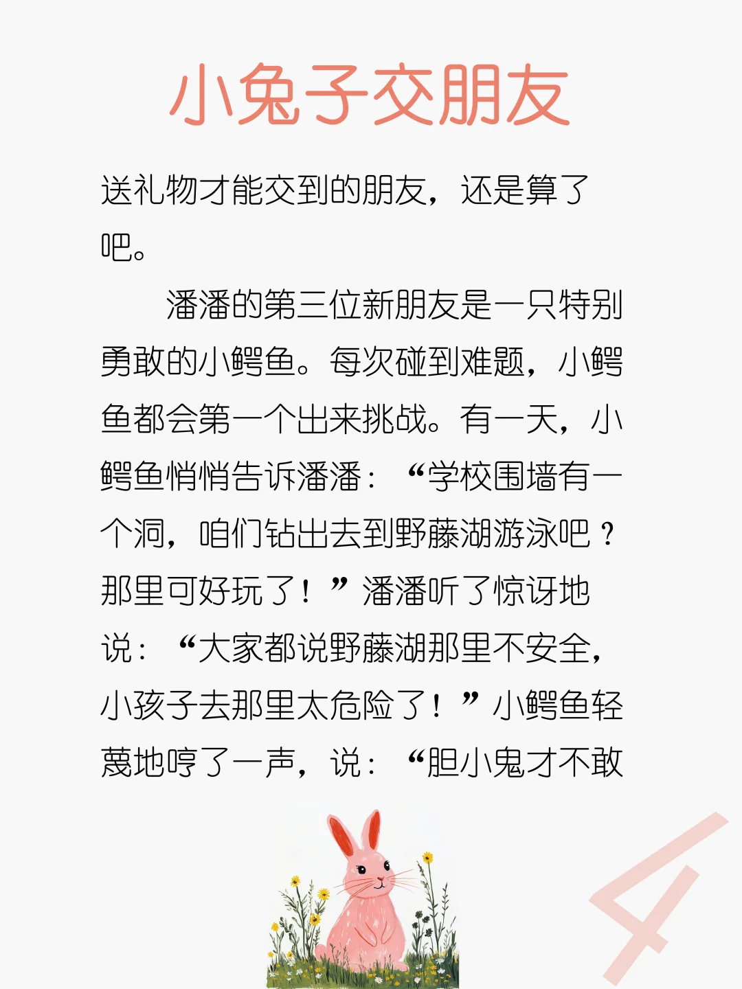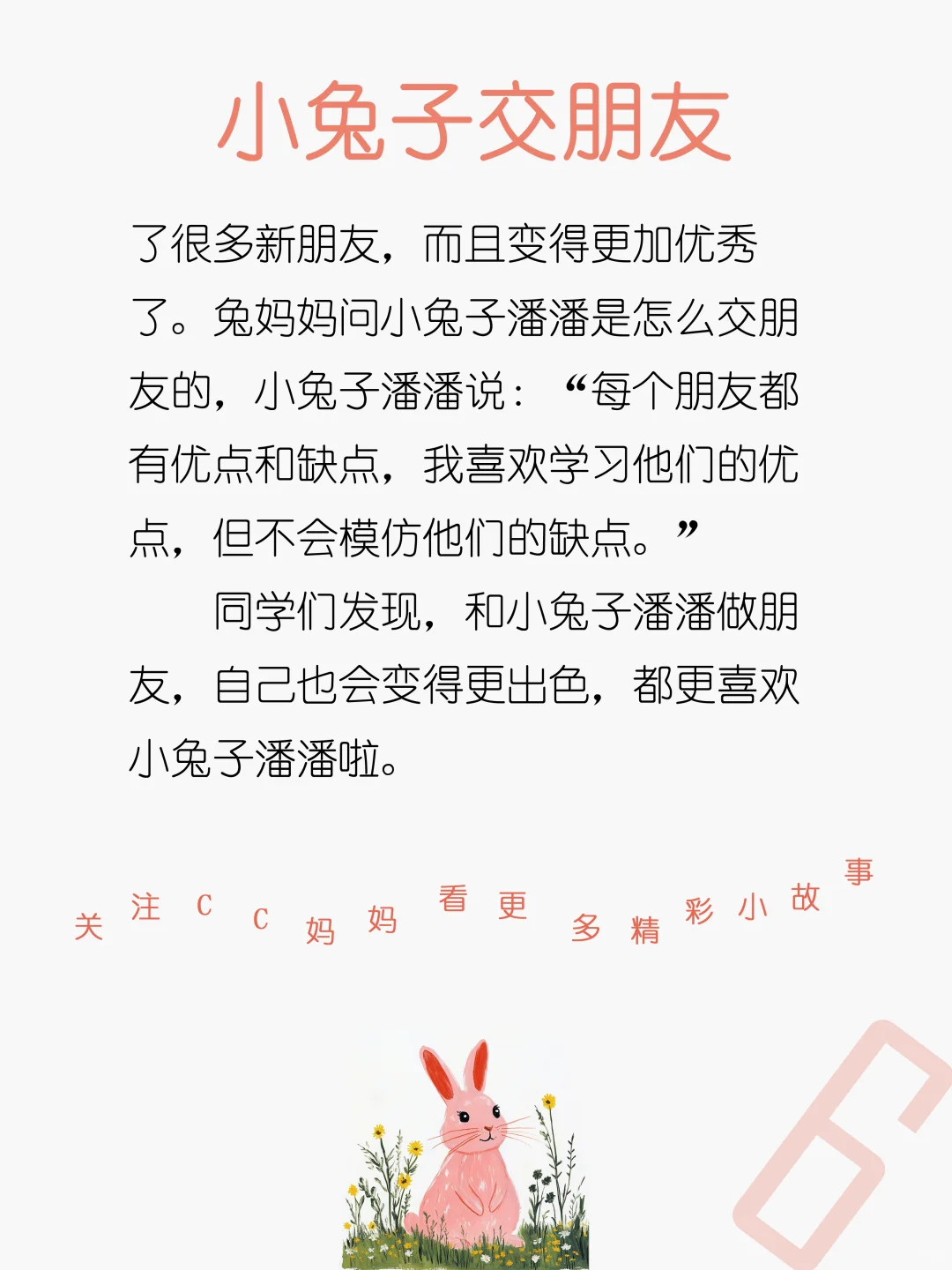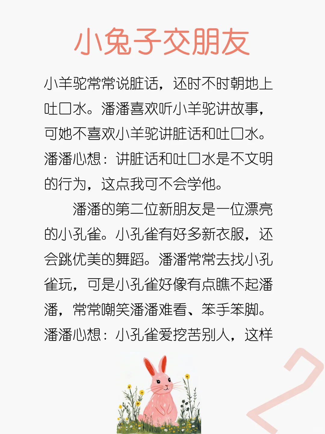 [星R]写这个故事的契机是几周前看到有评论说希望写一篇关于远离“毒朋友”的故事。查了一些资料,结合自己的观察,个人感觉孩子在选择朋友、和朋友相处之中有一个重要的点是“具备明辨是非的能力”,这是需要爸爸妈妈在言传身教中赋予孩子的。还有就是不管我们多喜欢我们的朋友,也不要学习朋友身上的缺点和坏习惯哦~ [郁金香R]希望宝贝们可以像文中的小兔子一样,只学优点,不学缺点,这样才可以变得越来越优秀呀~ 也欢迎大家留言指正或补充哦~ [晚安R]各位大宝贝小宝贝晚安~好梦~