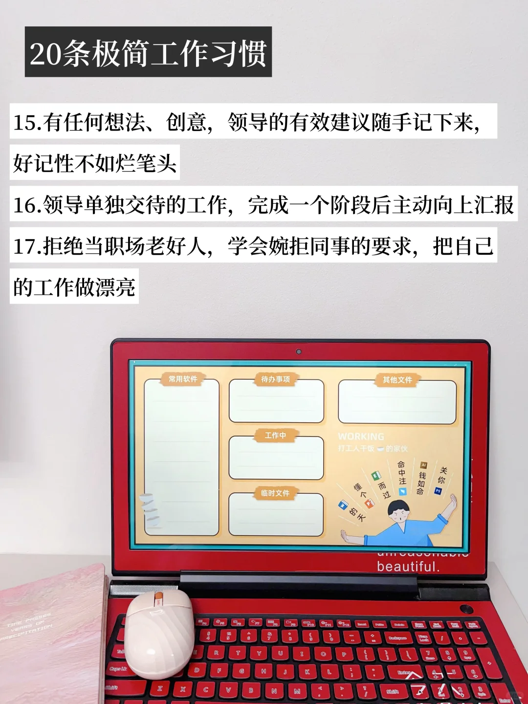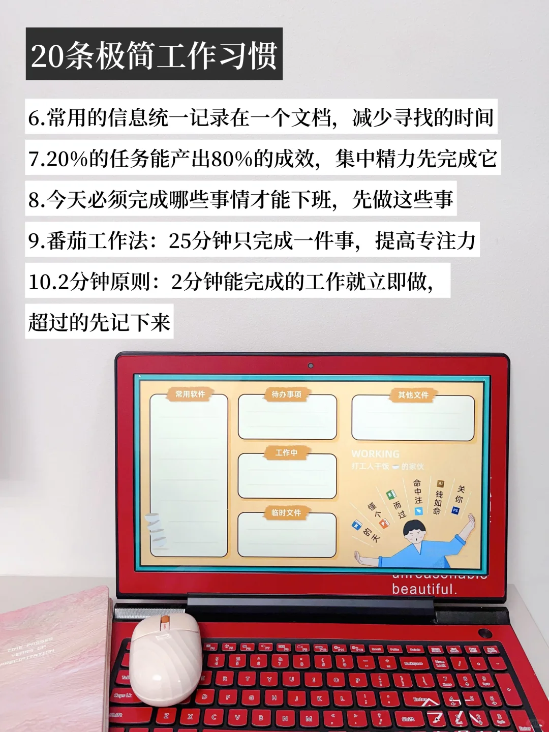 大家好[派对R],这里是爱攒钱爱搞钱的阿猫👋 读书时讲究怎么提高学习效率,工作时就要讲究如何提高工作效率 今年主业真的超级忙碌,更要注重效率,找到如何让工作有条不紊的方法 今天总结20条极简工作习惯👆一起来提高工作效率吧! 谢谢你的time,see you next~ [樱花R][樱花R][樱花R] 我是精简生活,一心搞钱,追求经济独立 持续分享高质量的自我提升|存钱省钱|搞钱技巧 让我们一起成为小富婆,早日退休🎉