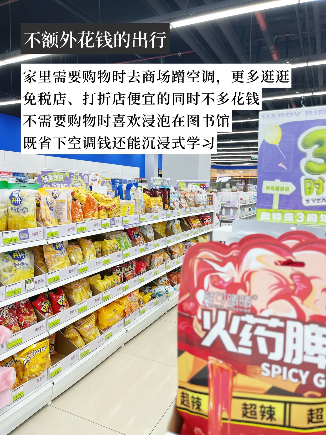 家里需要买东西时去商场蹭空调,更多逛逛免税店、打.折店便宜的同时不多花钱
