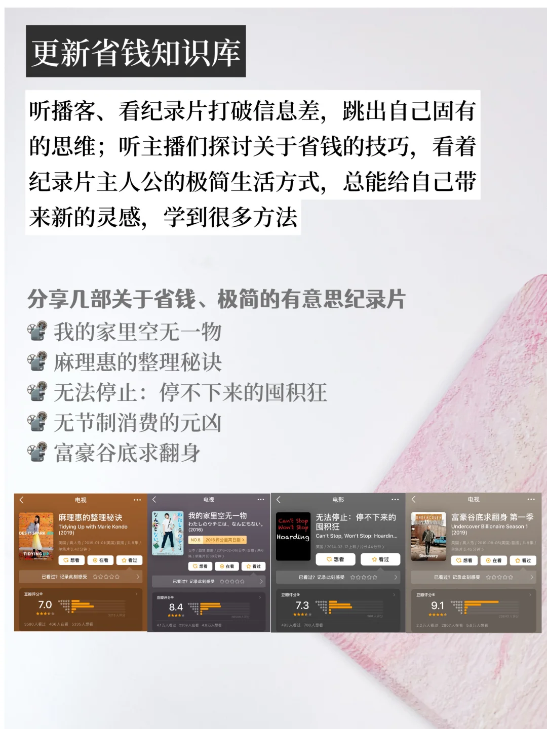 听播客、看纪录片打破信息差,跳出自己固有的思维;听主播们探讨关于省钱的技巧,看着纪录片主人公的极简生活方式,总能给自己带来新的灵感,学到很多方法