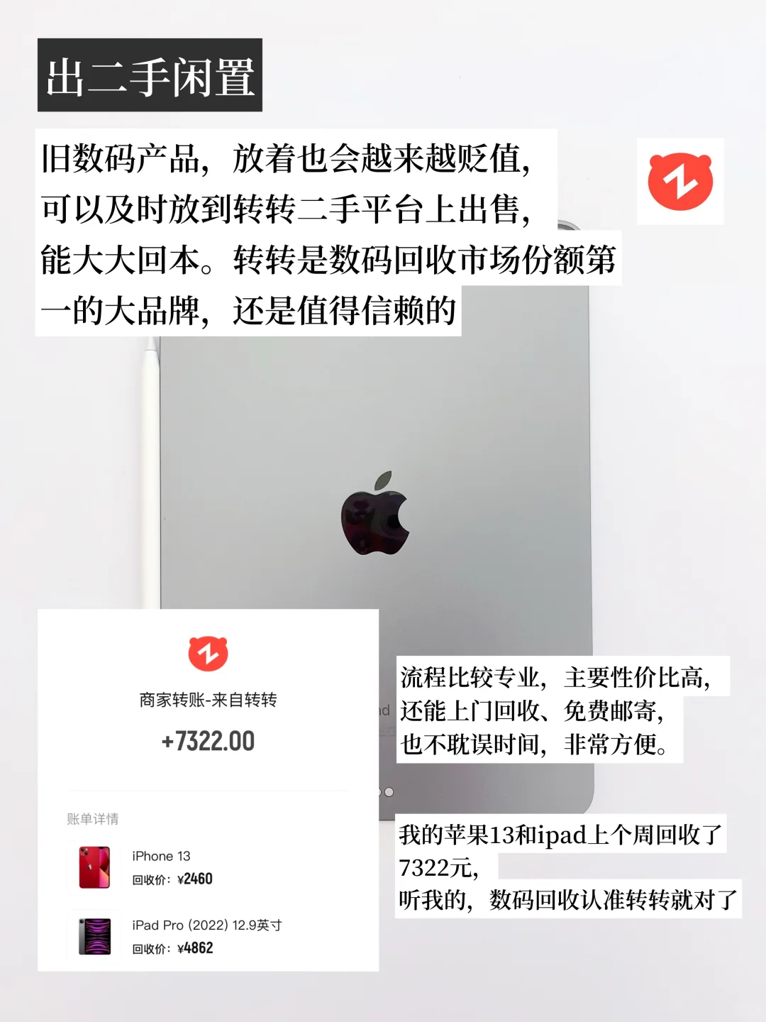 旧数码产品,放着也会越来越贬值,可以及时放到转转二手平台上出shou,能大大回本。转转是数码回收市场份额第.一的大品牌,还是值得信赖的