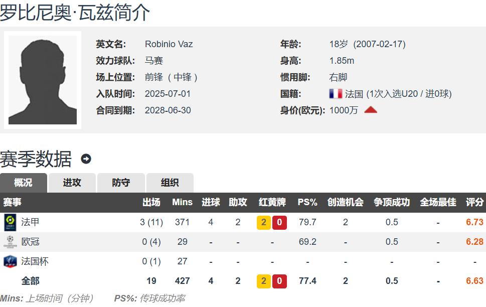 瓦斯现年18岁,身高1.85米,右脚球员,主打中锋位置,与马赛的合同至2028年。瓦斯本赛季代表马赛在法甲出场14次,其中仅有3次首发,合计出场371分钟,但贡献4球2助,效率很高;欧冠替补出场4次,合计仅29分钟,没有参与进球。