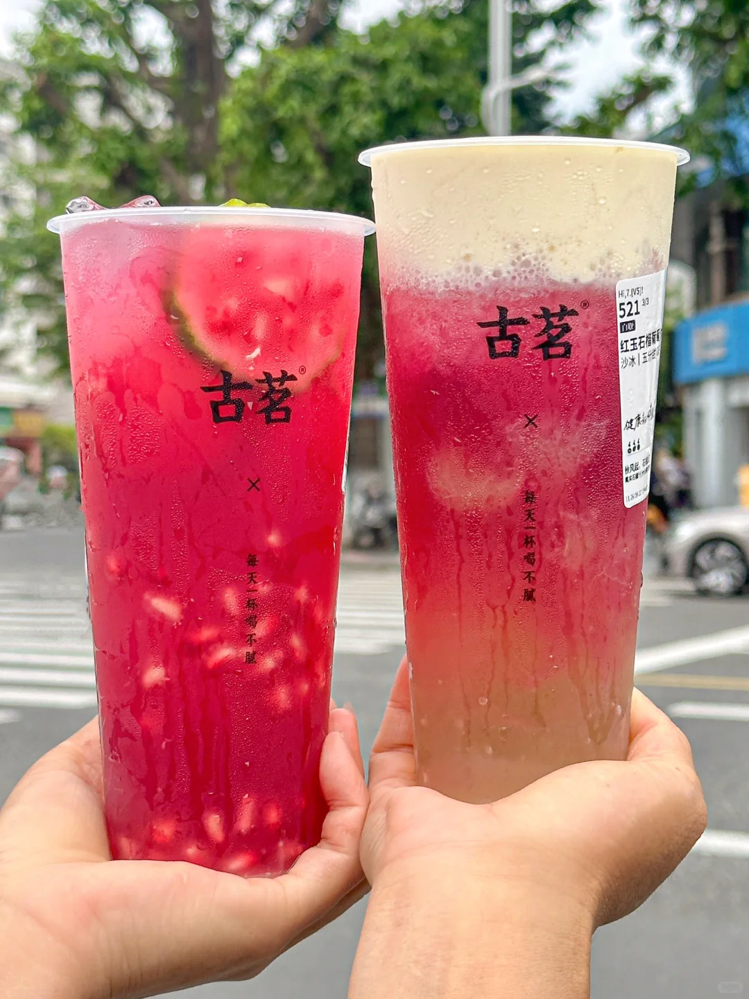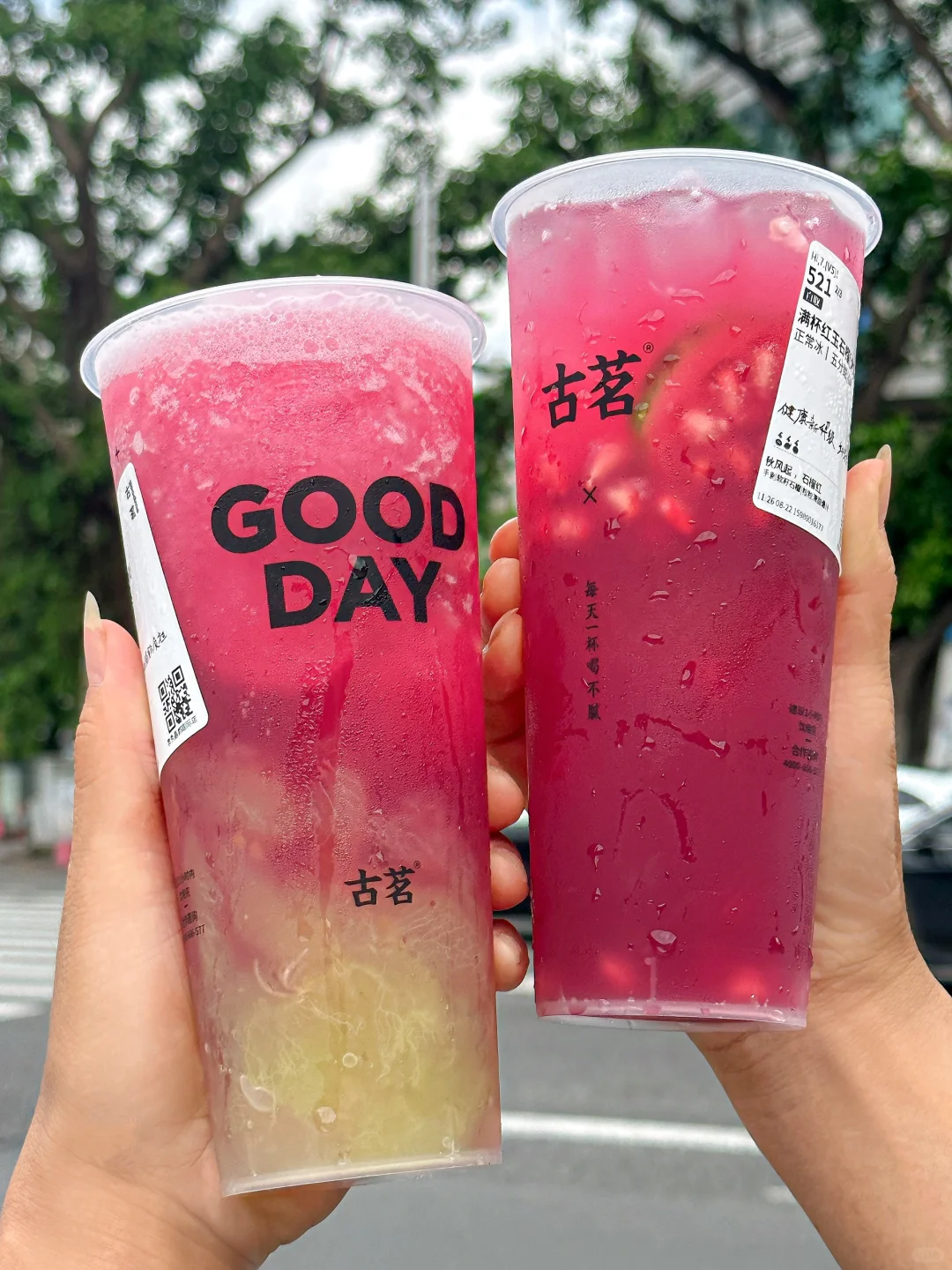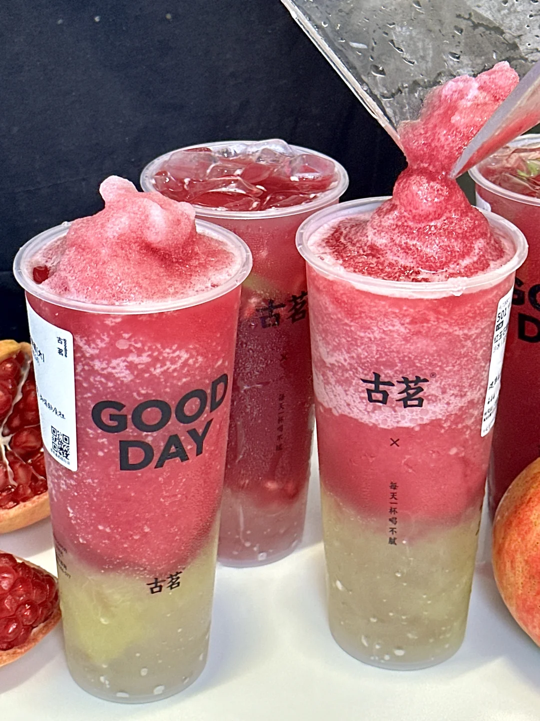 敢说这杯就是古茗必喝!!求求千万不要下架!! 新鲜现剥的石榴粒汁水好多!!甜中微涩恰到好处!石榴控真的爱惨了。。。 · ✔️满杯红玉石榴 石榴粒的汁水在嘴里爆开!!清甜爽口,酸甜解腻!还有淡淡的茉莉花香!!一口下去感觉清凉了许多😋😋 · ✔️红玉石榴葡萄 真的有被惊艳到!!!石榴+葡萄双重果味buff!打成绵密冰沙,每一口都能喝到大块葡萄🍇!自带清凉冻、口感好丰富啊~ DIY喝法:五分糖➕正常冰➕芝士奶盖(搅匀之后奶fufu的超好喝😭 · 真的!!!不好喝来打我!!! ·