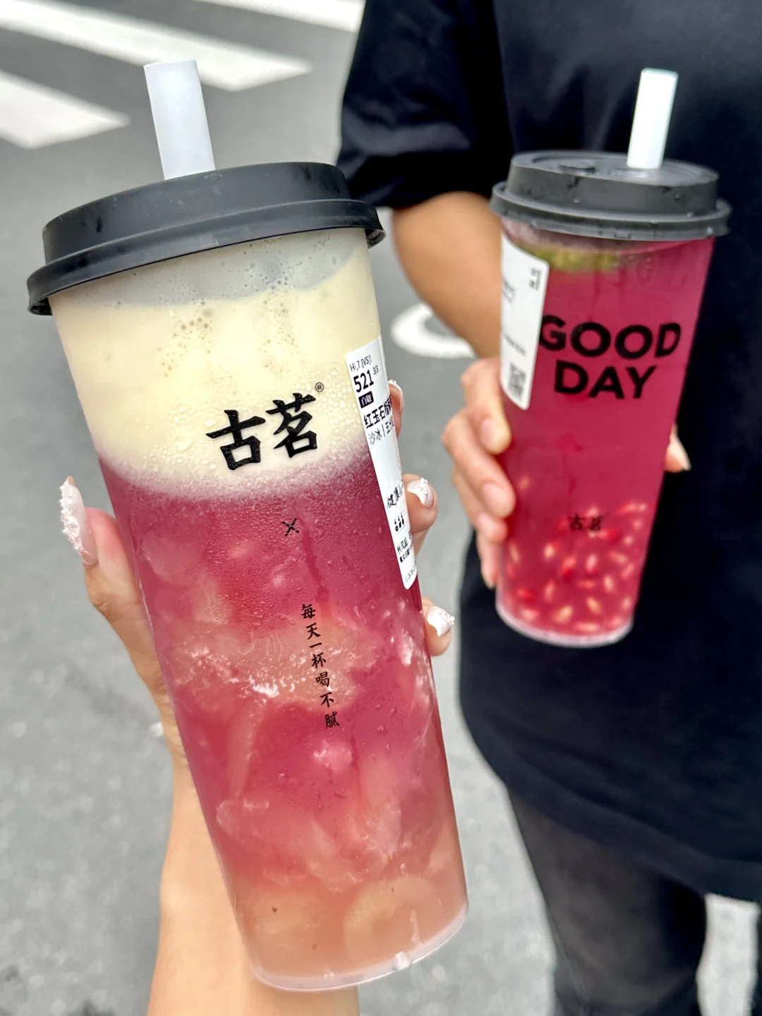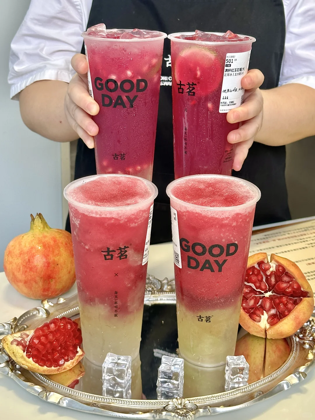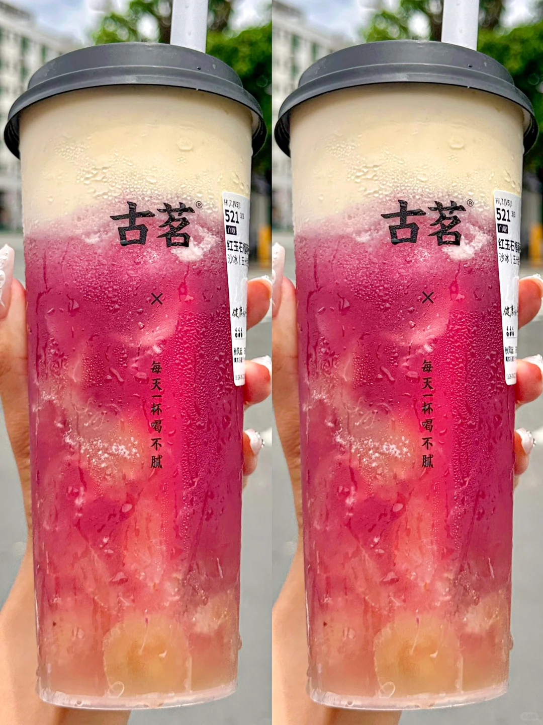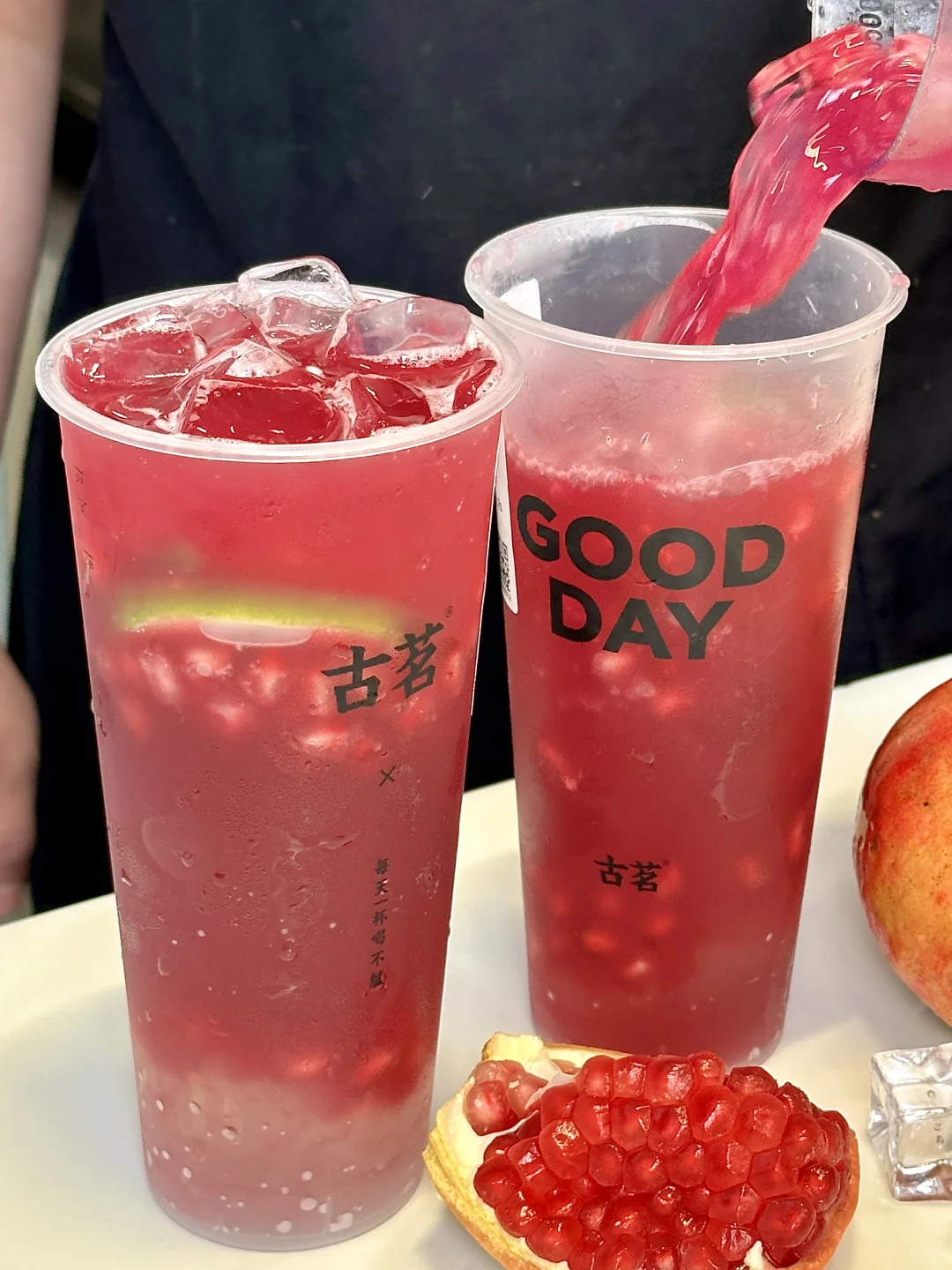 敢说这杯就是古茗必喝!!求求千万不要下架!! 新鲜现剥的石榴粒汁水好多!!甜中微涩恰到好处!石榴控真的爱惨了。。。 · ✔️满杯红玉石榴 石榴粒的汁水在嘴里爆开!!清甜爽口,酸甜解腻!还有淡淡的茉莉花香!!一口下去感觉清凉了许多😋😋 · ✔️红玉石榴葡萄 真的有被惊艳到!!!石榴+葡萄双重果味buff!打成绵密冰沙,每一口都能喝到大块葡萄🍇!自带清凉冻、口感好丰富啊~ DIY喝法:五分糖➕正常冰➕芝士奶盖(搅匀之后奶fufu的超好喝😭 · 真的!!!不好喝来打我!!! ·