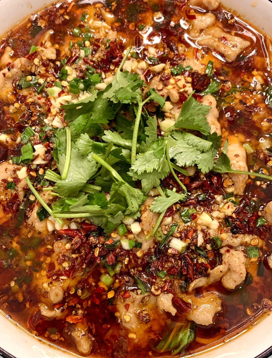 4⃣️倒入汤水,撒上葱花、蒜末、炒好的辣椒花椒、淋入热油即发出香气,撒上香菜即可