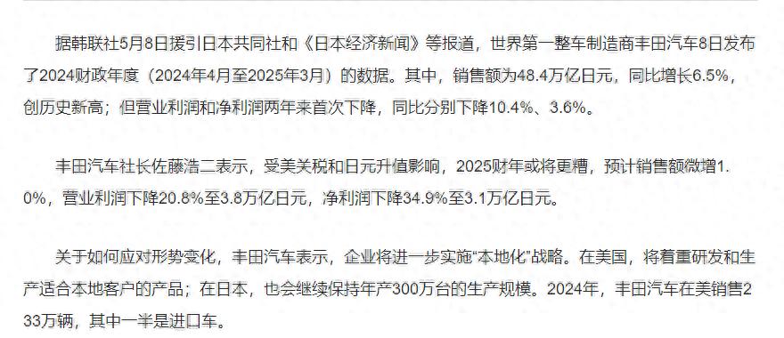 到了2025年,更是不得了,就以丰田为例,2025年一季度净利润同比下降37%,二季度净利润同比下降55%,三季度营业利润剧降28%,按照丰田的自己给出的数据,全年的净利润同比下降约34.9%,考虑到日车在我国销量的全面溃散,美国市场可谓是它最后的救命稻草,但川宝偏偏此时,把日本充当成了血包,15%的关税还没落地,30%的关税就已经开始!