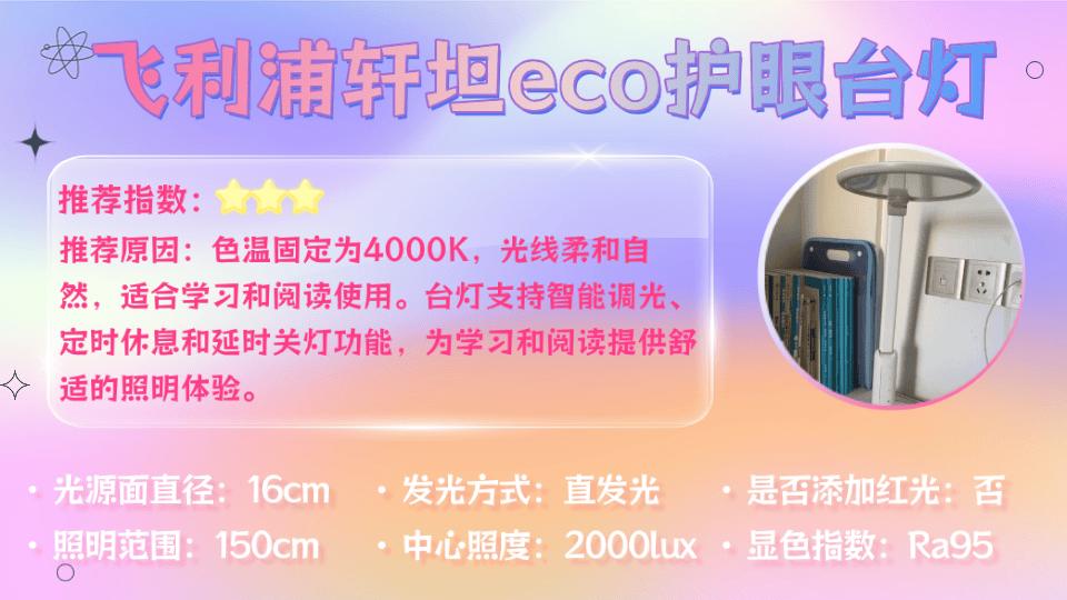 孩子护眼灯怎么选购?飞利浦轩坦Eco台灯色温固定为4000K,光线柔和自然,适合长时间学习和阅读使用。灯身采用树脂材质,耐用且轻便,直发光设计搭配16厘米光源面,照明范围可覆盖约150厘米的桌面区域。台灯支持智能调光、定时休息和延时关灯功能,可根据环境和使用需求调节光线强度,为学习和阅读提供舒适的照明体验。