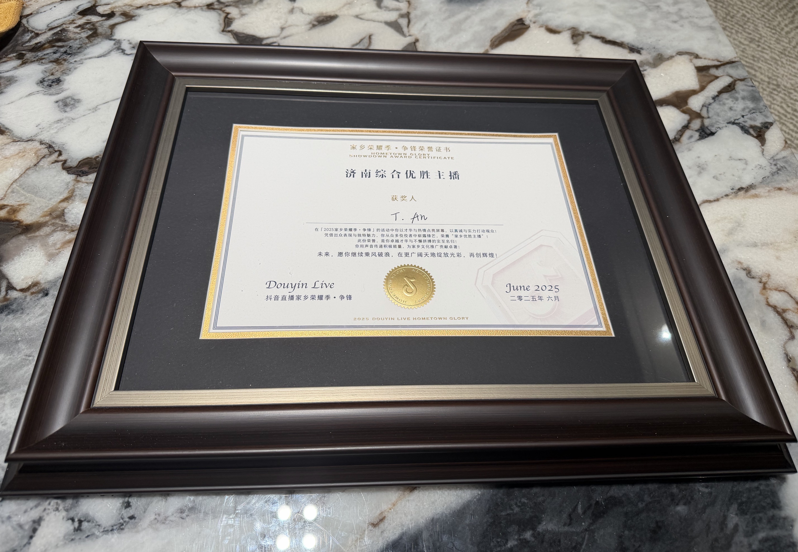 所以非常想做出成绩回馈家人。在《2025 抖音直播 家乡荣耀季 • 争锋》中,我获得了“济南综合优胜主播”,地区第一!当我把奖牌和证书捧在父母面前,从他们的眼神中,终于看到了对我的认同。