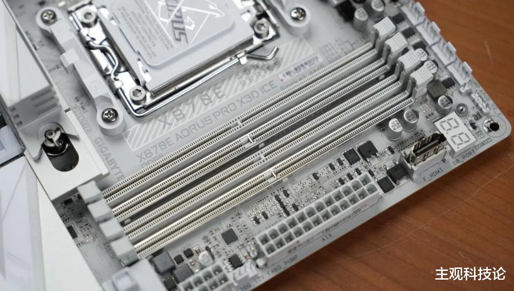 技嘉X870E AORUS PRO X3D ICE 电竞冰雕延续了该系列标志性的纯白美学,ATX版型搭配覆盖全面的银白色散热装甲,视觉上冷峻而优雅。其设计超越了外观层面,8层背钻PCB板的运用,能有效减少信号反射与干扰,为内存稳定冲击更高频率(官方标称支持DDR5-9000MT/s)奠定了物理基础。强化过的内存插槽与厚重的金属背板,共同确保了主板在高负载下的结构强度与散热效率。