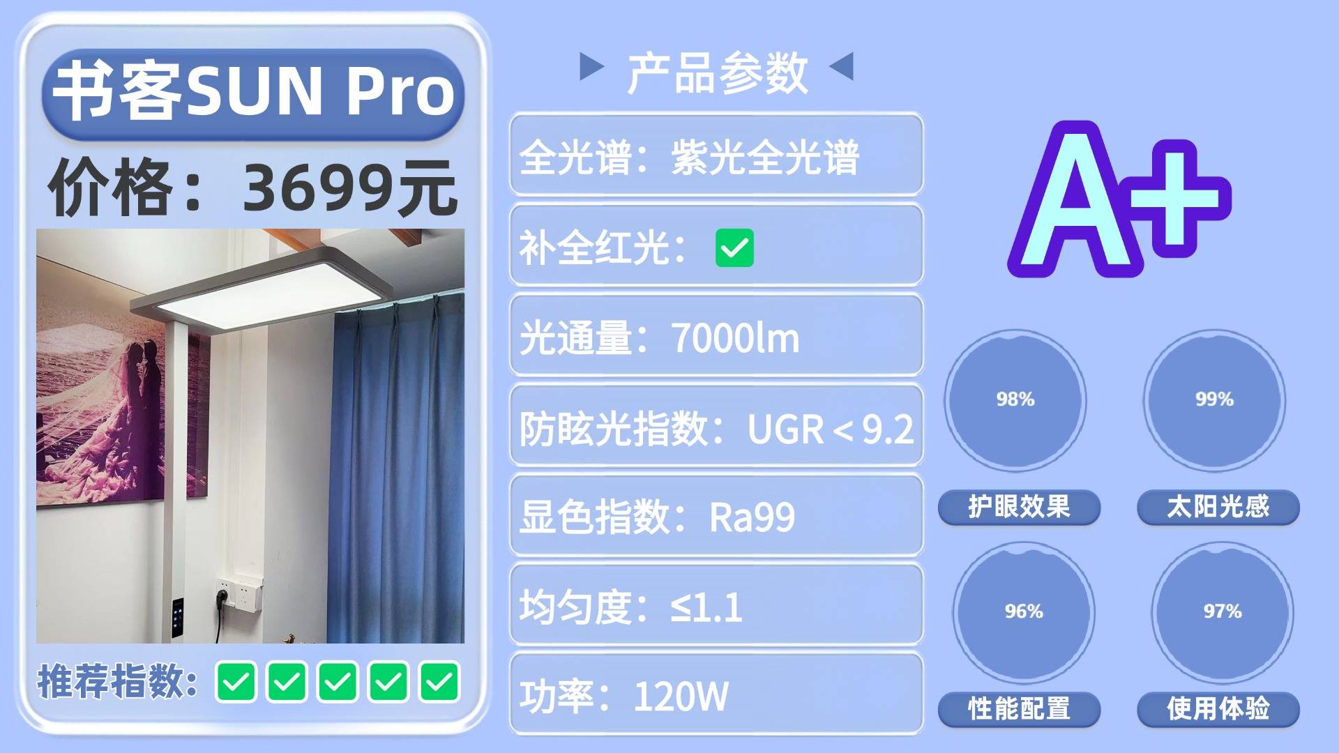 推荐款:书客护眼大路灯SUN2——超过100家电媒体实测,深度护眼指数第一,有效延缓83%用眼疲劳并降低92%近视风险!