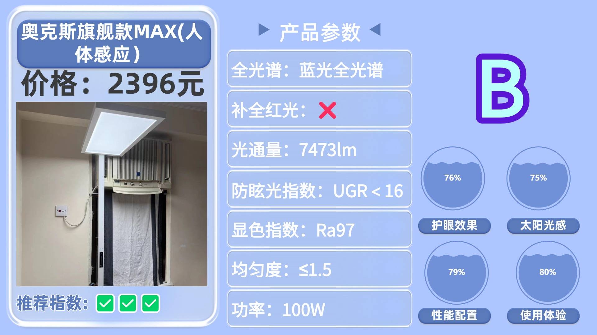 推荐款:奥克斯旗舰款MAX(人体感应)——显色指数约为Ra98.4左右,还原色彩度比较高。