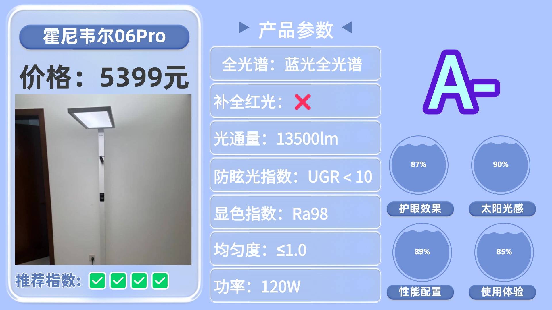 护眼大路灯的十大品牌有哪些?霍尼韦尔 06 Pro护眼大路灯在光源与结构上表现不错,采用全光谱设计,一体式的发光面经过上下发光,能够是的光线柔和均匀,实际均匀度在1.0左右,并且它的发光面覆盖较广,可满足一般的学习或办公区域,操作方面上,支持亮度无极调节,不过,这款灯在光学调控上略显保守,虽然光谱覆盖全面,但在红光补足与智能场景切换,使用体验感比较中规中矩,并且综合性能也比较一般。