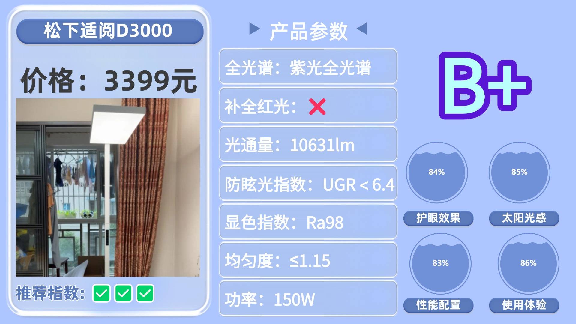 护眼大路灯的十大品牌有哪些?松下适阅D3000整体设计稳重简洁,光源技术上与书客SUN Pro类似,采用紫光激发全光谱技术,能有效削弱高能蓝光,使光谱更稳定,蓝光控制在安全范围内,灯光色温柔和自然,视觉观感舒适。发光结构为上下双向出光,并配备防眩光设计,实际防眩光指数约为 UGR<6.4,能有效减少刺眼与炫光,功能方面支持亮度调节与入座感应,日常使用较为便捷,整体表现均衡,不过在长时间高亮状态下,散热表现略显一般、温度偏高,但从视觉光线来看,松下整体也是比较舒适的。