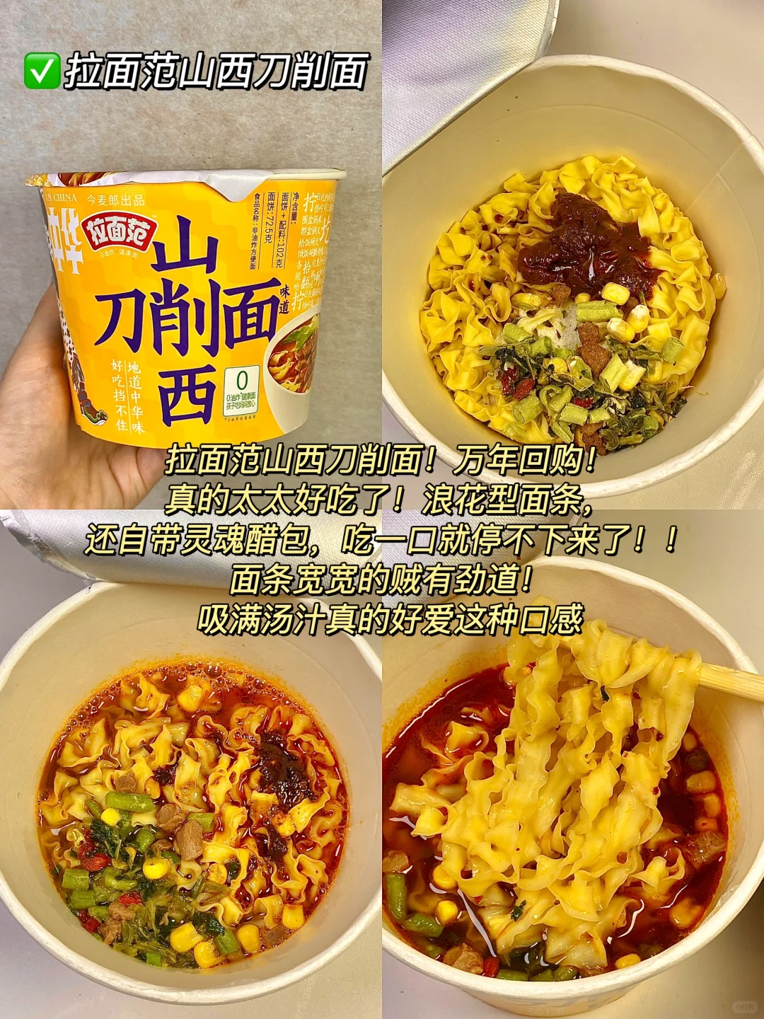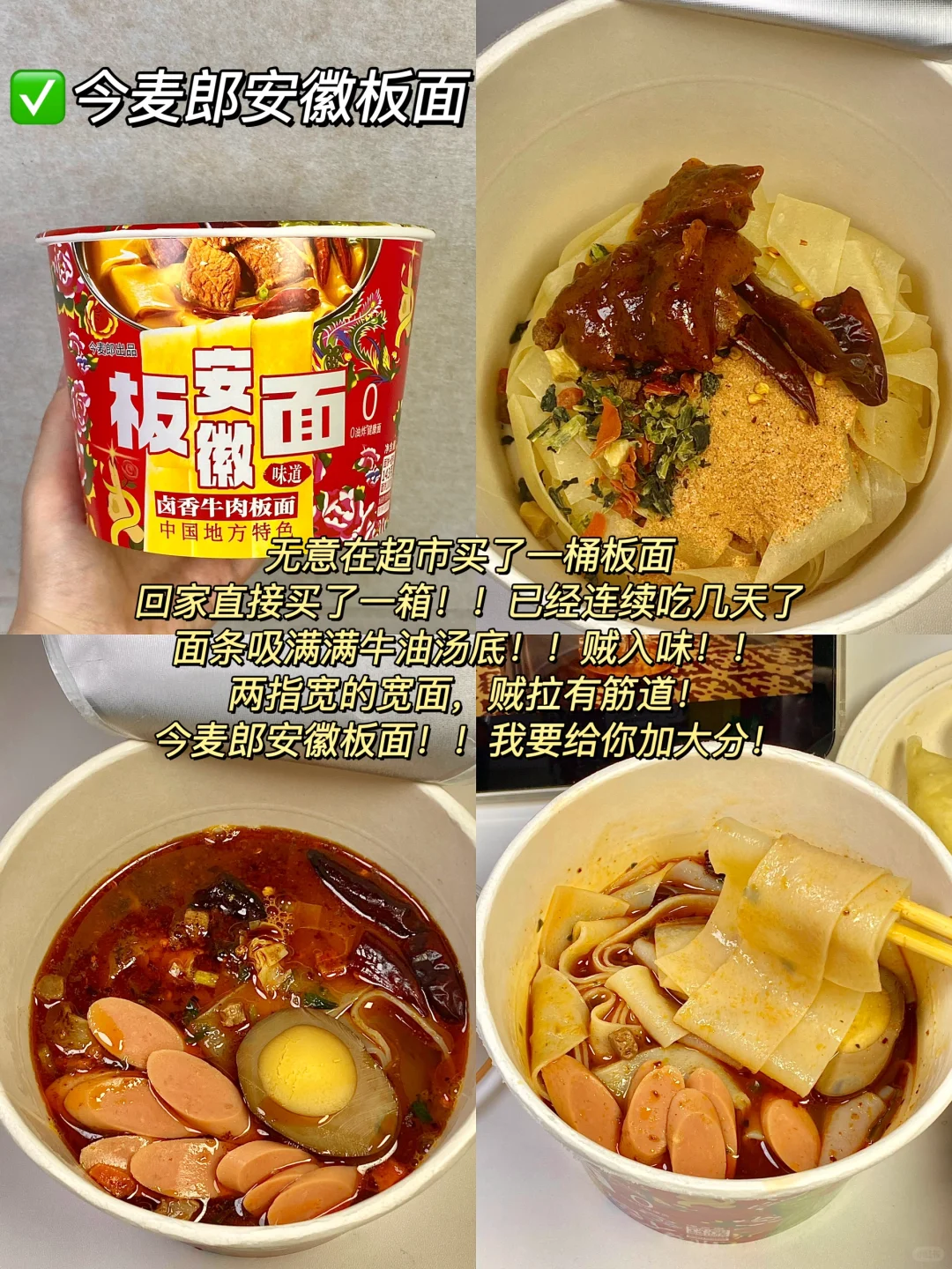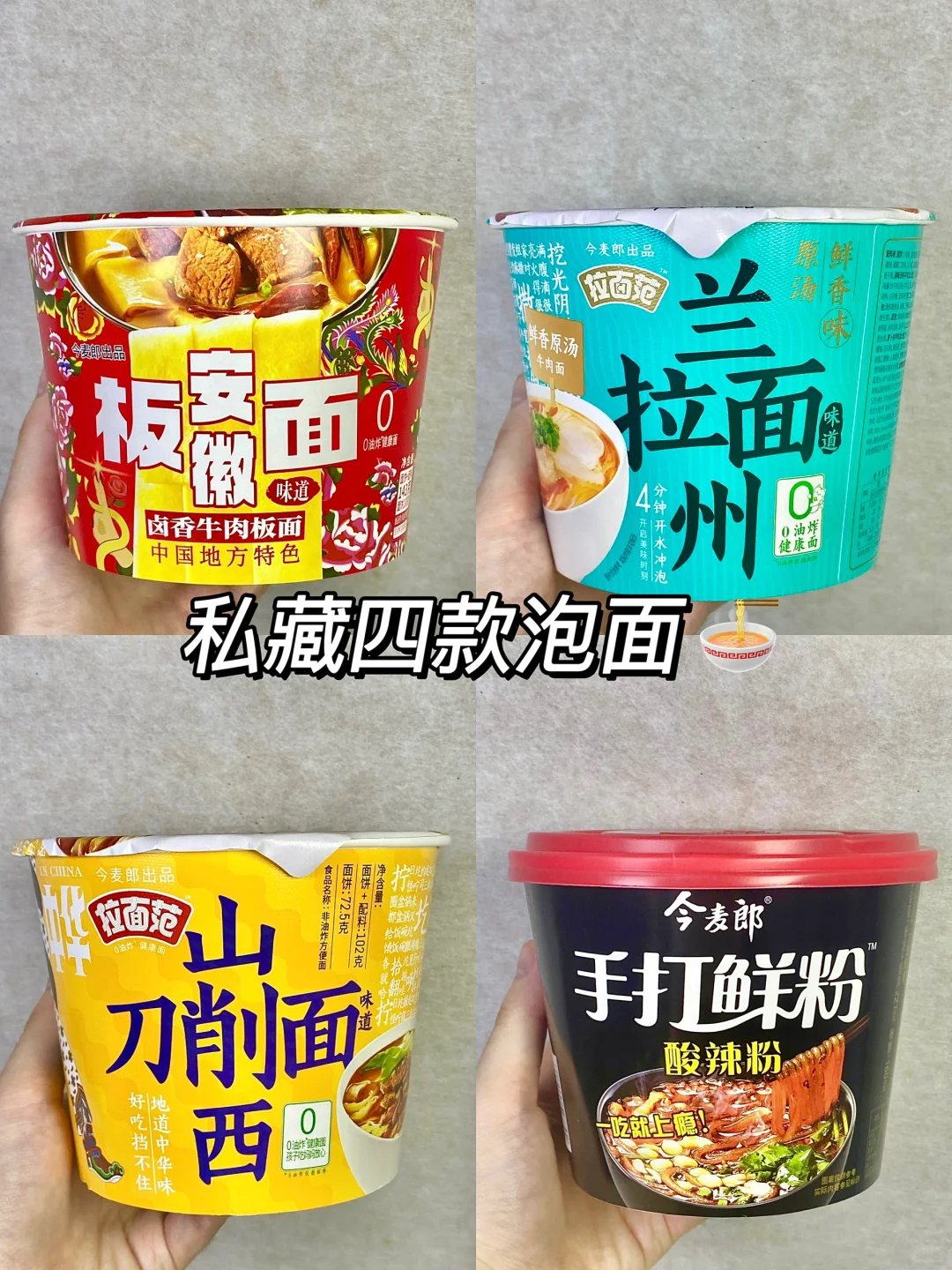 分享一下本人私藏的泡面 这四款每一个都巨巨好吃! 吃起来又麻又辣很过瘾,太适合能吃重口味的宝子 了! 1⃣️今麦郎手打鲜粉 粉用的是湿粉,口感很好!很有嚼劲,筋道又q弹!泡3分钟就可以了!吃起来qq弹弹的,很有嚼劲!又麻又辣很过瘾~ 2⃣️拉面范兰州拉面 免煮的兰州拉面,真的也好好吃!汤底很浓郁,料包里还有萝卜,真的有兰州拉面那个味!面条裹着汤汁,贼入味! 3⃣️拉面范山西刀削面 拉面范山西刀削面!万年回购!真的太太好吃了!浪花型面条,还自带灵魂醋包,吃一口就停不下来了!!面条宽宽的贼有劲道!吸满汤汁真的好爱这种口感 4⃣️今麦郎安徽板面 无意在超市买了一桶板面 回家直接买了一箱!!已经连续吃几天了 面条吸满满牛油汤底!!贼入味!!两指宽的宽面,贼拉有筋道! 今麦郎安徽板面!!我要给你加大分!