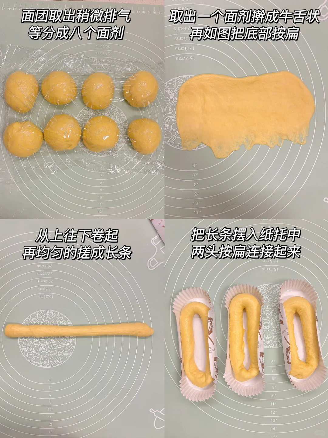 3️⃣面团发酵好后取出稍微排气,等分成八个面剂,取出一个面剂,取出一个面剂先擀成牛舌状,再如图把底部按扁;