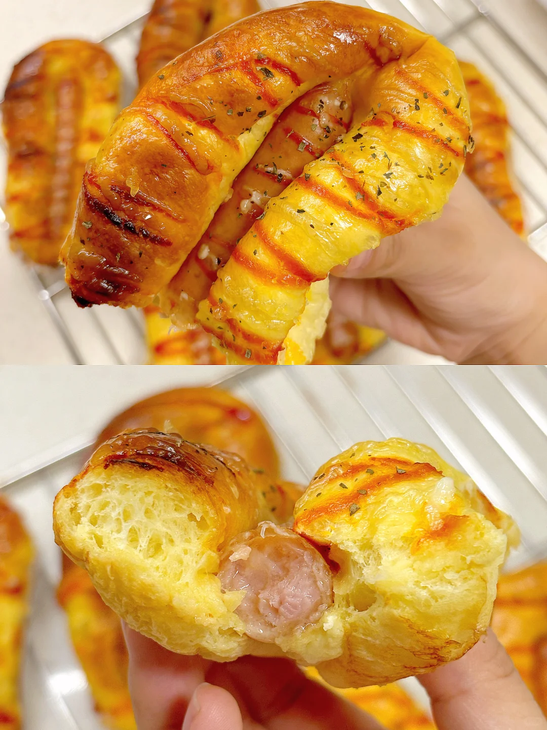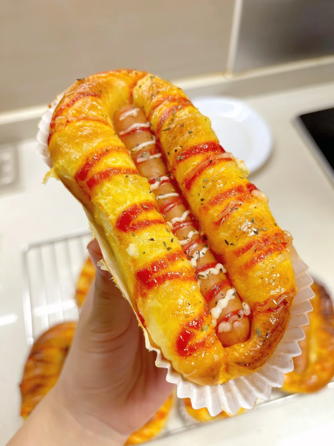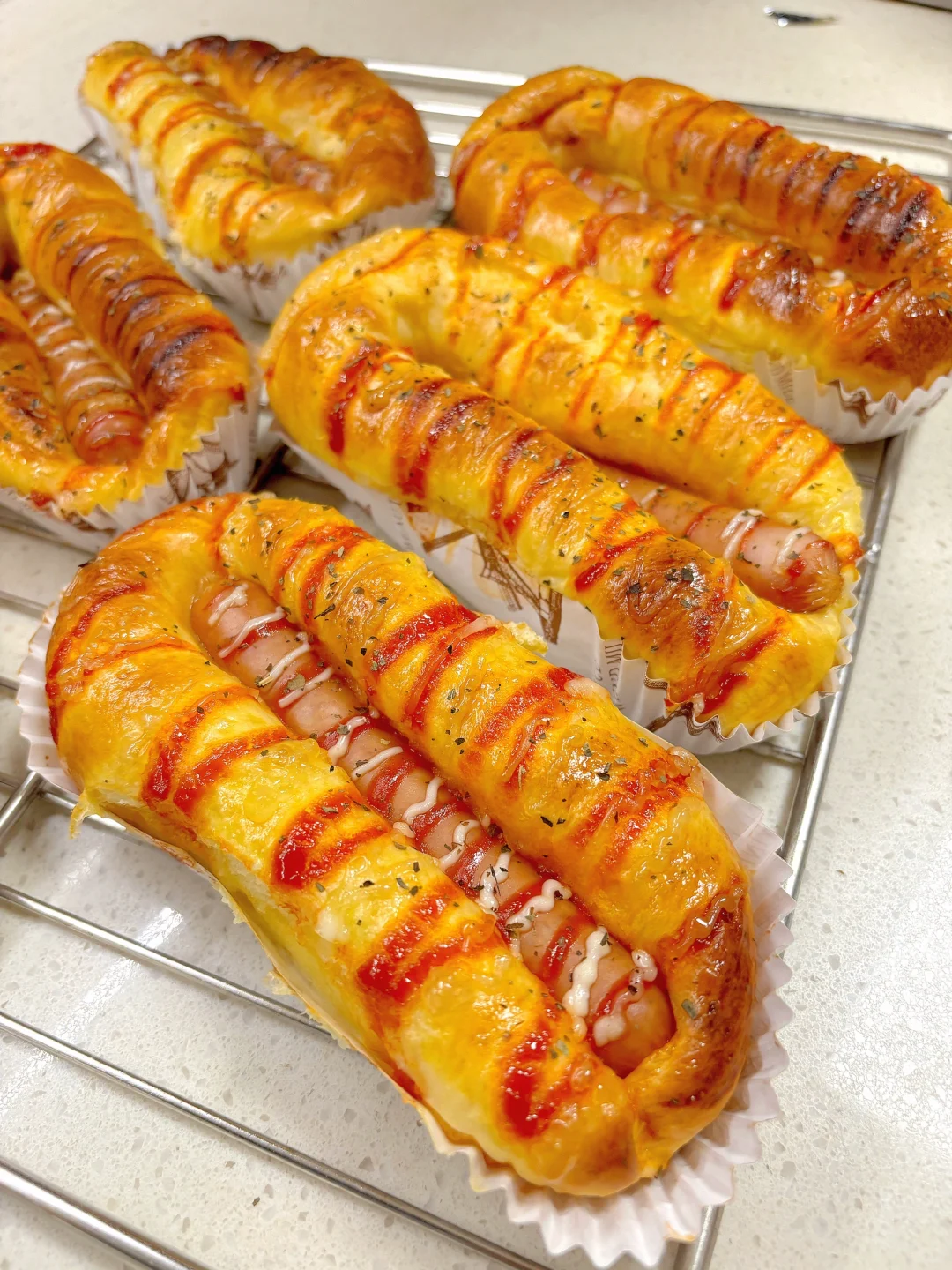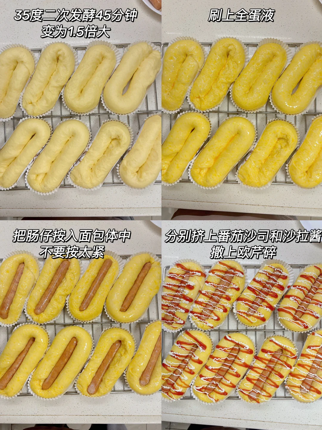 5️⃣刷上全蛋液,把肠仔按入面包体(不要按太紧),分别挤上番茄沙司和沙拉酱,撒上欧芹碎;