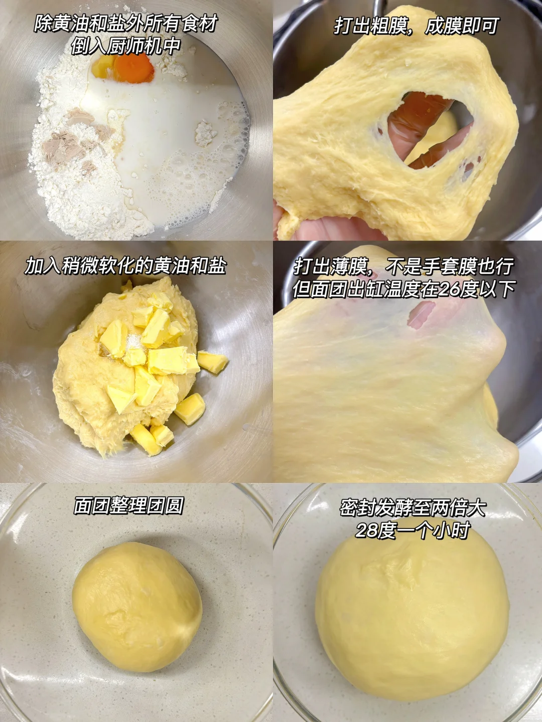 1️⃣ 除黄油和盐外所有食材倒入厨师机中,打出粗膜,成膜即可,加入稍微软化的黄油和盐,打出薄膜,不是手套膜也行;