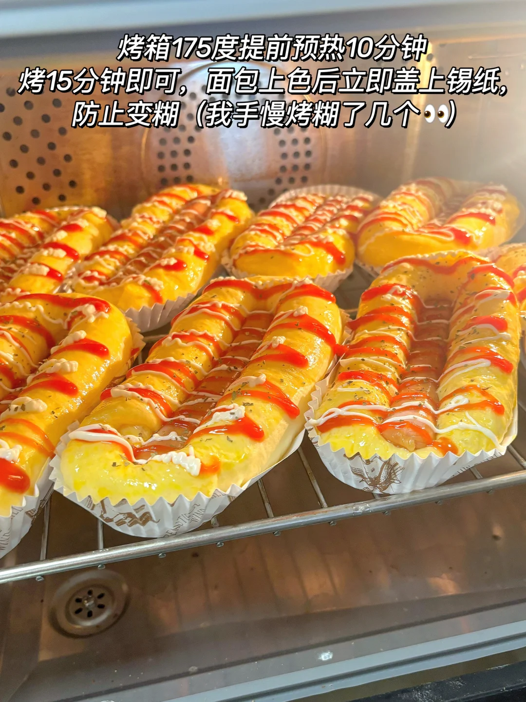 6️⃣烤箱175度提前预热10分钟,烤15分钟左右即可,面包上色后立即盖上锡纸防止烤糊哦。