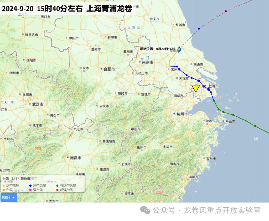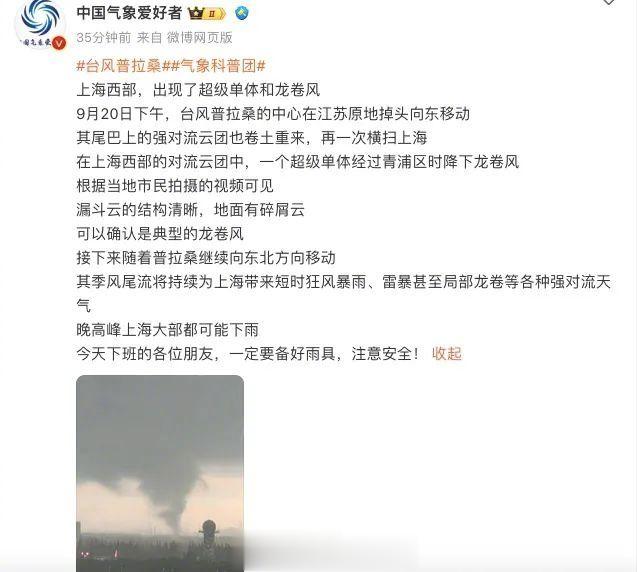 另据“龙卷风重点开放实验室”消息,2024年9月20日,在台风“普拉桑”的影响下,15时40分左右上海市青浦区发生龙卷风。
