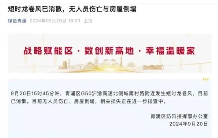 另据上海市青浦区人民政府新闻办公室消息,9月20日15时45分许,青浦区G50沪渝高速北侧城南村路附近发生短时龙卷风,目前已消散。目前无人员伤亡、房屋倒塌,相关损失正在进一步排查中。