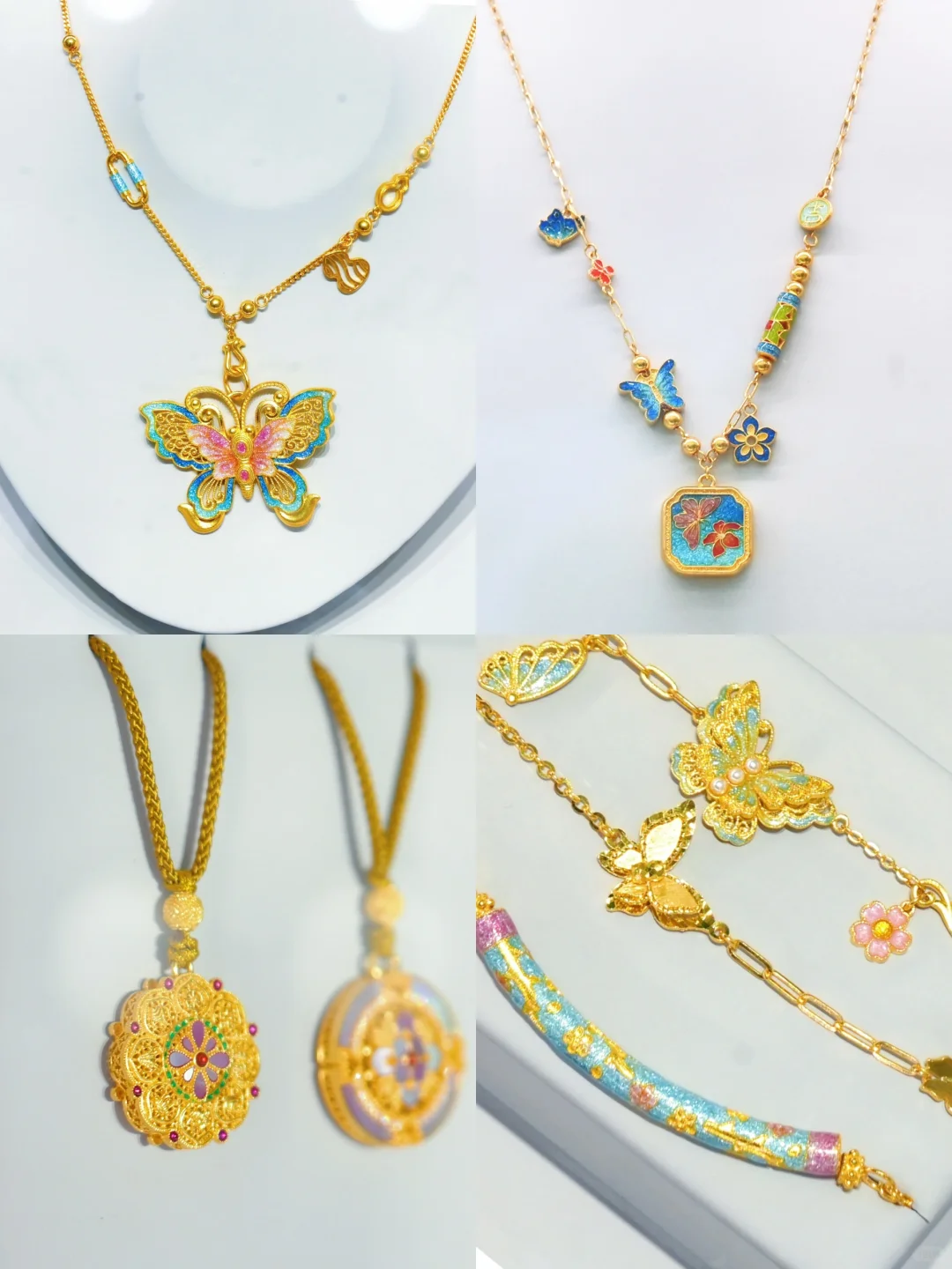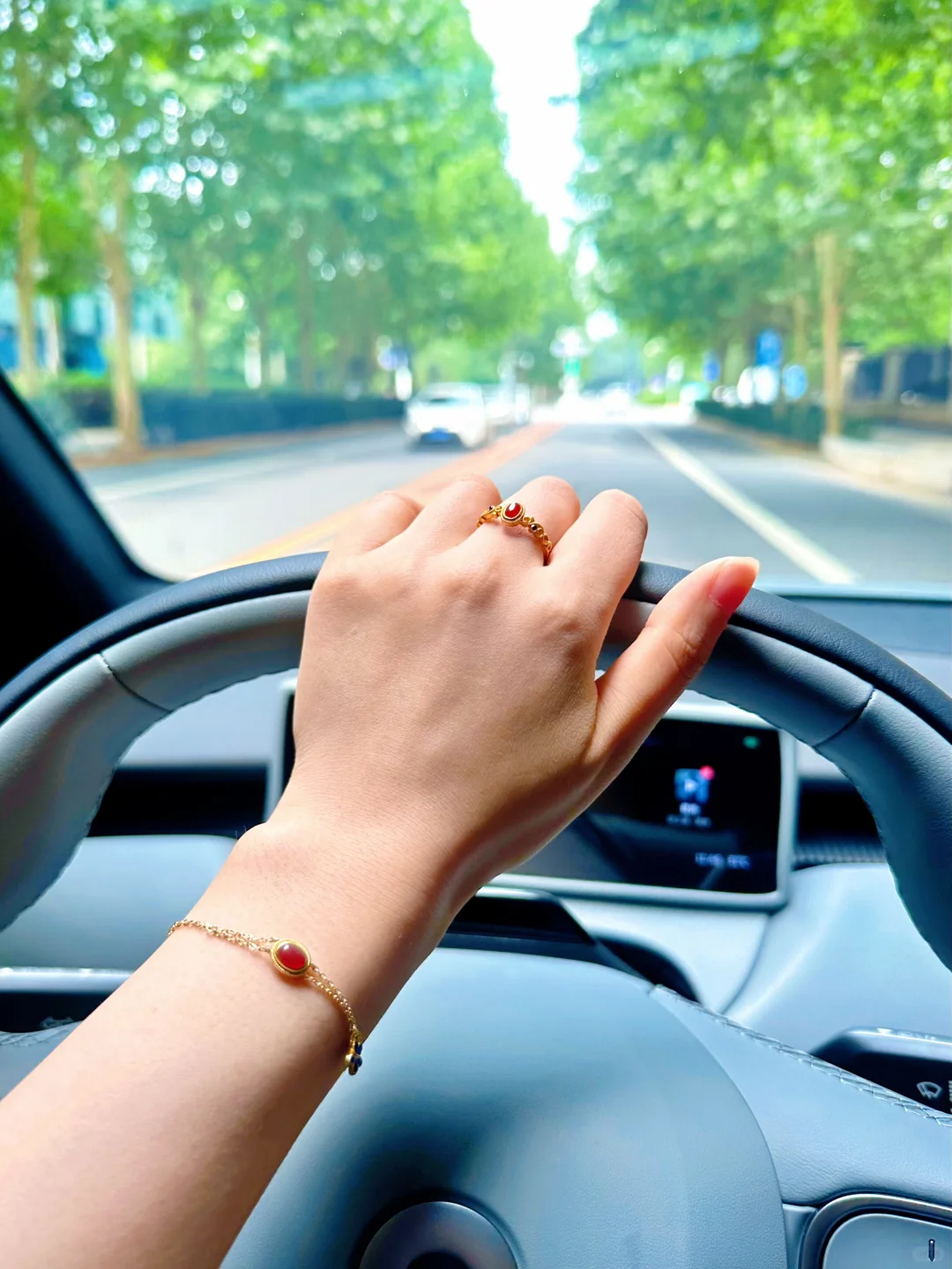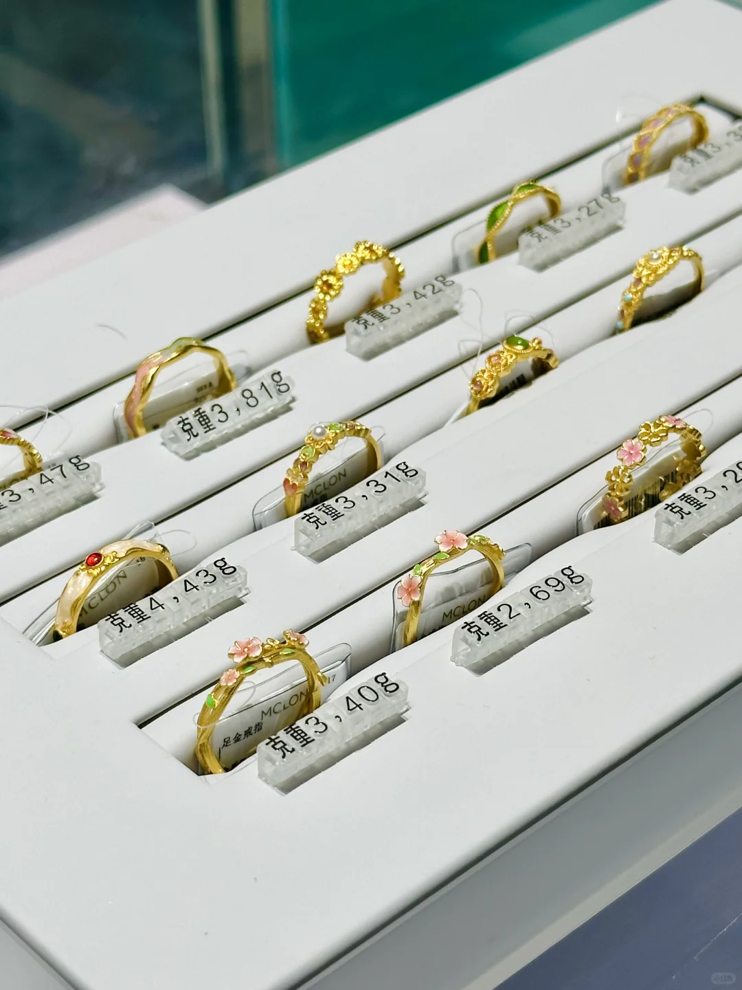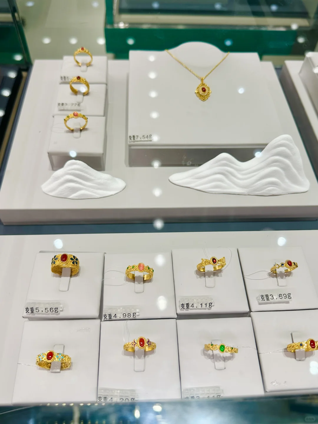 试戴了一圈,我最后选了一款「花丝凤舒」戒指和一条镶嵌了红玉的小兰花手链。红蓝宝石和黄金搭配也一点不俗气,大气温柔又百搭