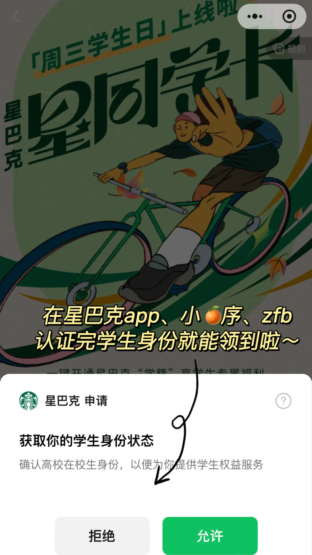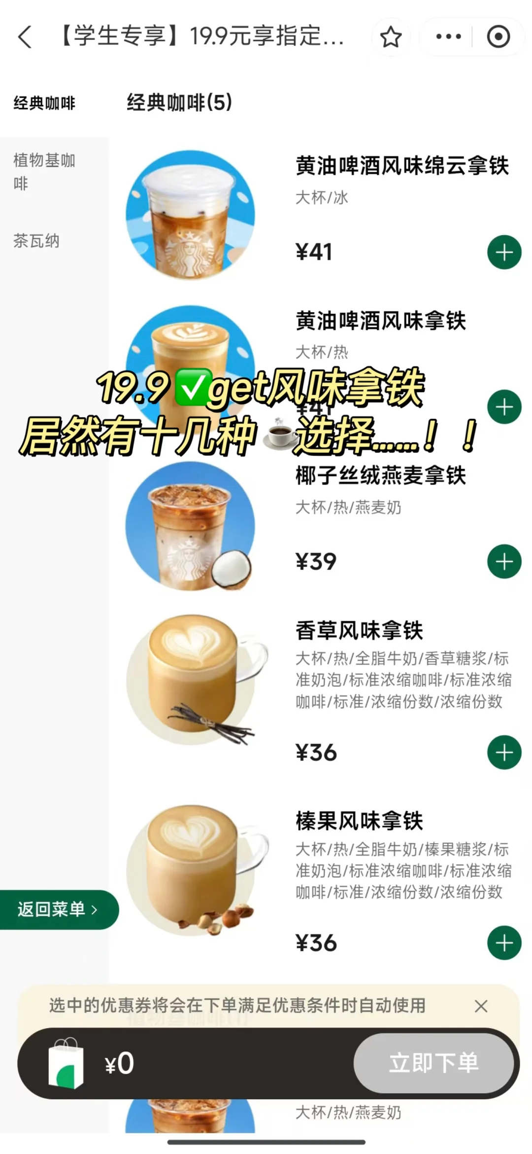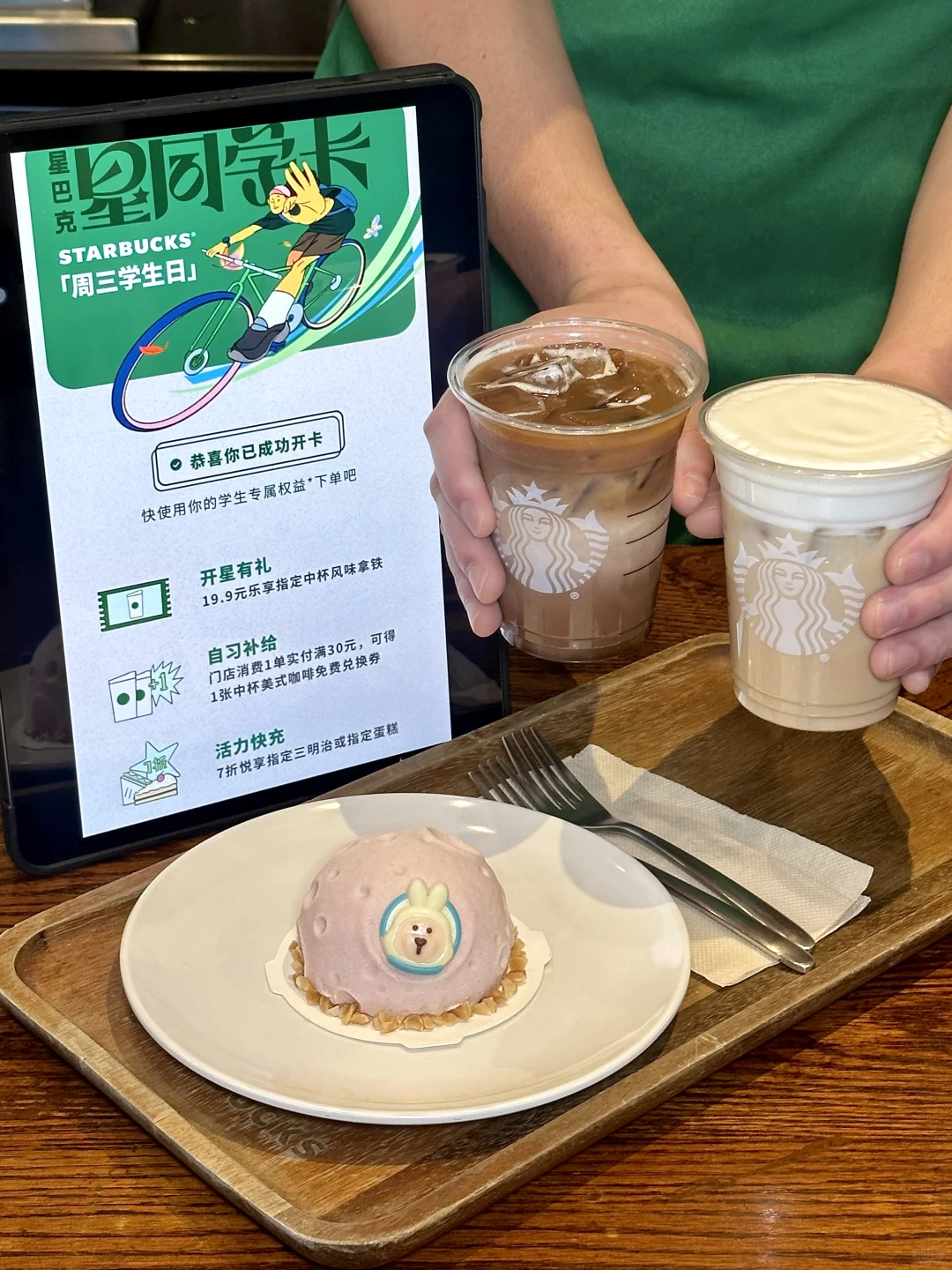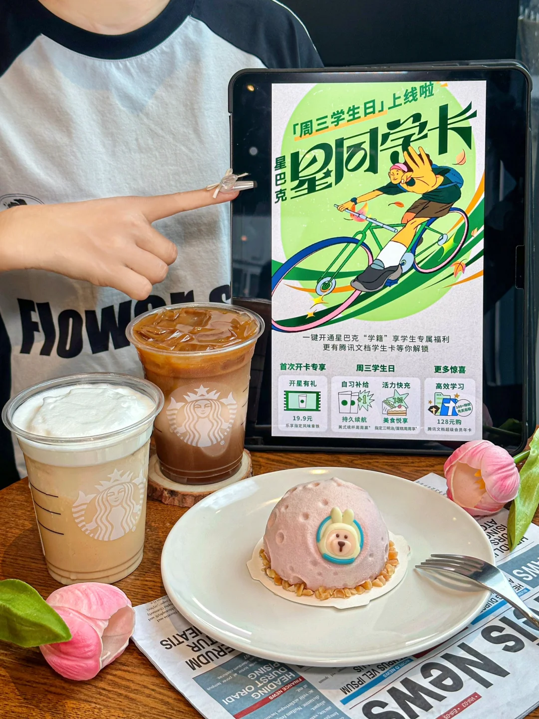 啊啊啊星巴克周三学生日谁还不知道! 19.9r get中杯风味拿铁!!! 实付满30还有中杯美式喝 还有7折的三明治蛋糕…… 😭😭简直不要太宠学生党!! · 活动攻略: 1️⃣ 9.18起,星巴克星同学卡2.0权益上线! 首次开卡礼就能喝到19.9r的风味拿铁(中杯,含新品哦!) Ps:有效期7天 (线下门店、啡快可用) 2️⃣每周三在门店完成30元消费后获得一杯美式🆓(中杯) Ps:有效期24小时,每周1次!!真的福利超大 3️⃣每周三还能get一张指定三明治蛋糕7.折 Ps:仅线下门店,每周1次~ · ✔️指定星巴克风味拿铁给大家科普一波: 巴旦木拿铁、红茶咖啡鸳鸯拿铁、金烘香草巴旦木拿铁、椰子丝绒燕麦拿铁、榛果风味巴旦木拿铁、榛果味拿铁、大溪地香草风情巴旦木拿铁、香草味拿铁、抹茶冻山系拿铁、黄油啤酒风味绵云拿铁、桂花风味拿铁、桂花风味铁观音拿铁、板栗红豆沙拿铁!! 以及星巴克不定时指定的其他风味拿铁饮品!!! · 这个活动中国大陆高校在校生 (专科本科研究生,含硕士博士都可以加入了👏) 快一起喝[害羞R][害羞R] ·
