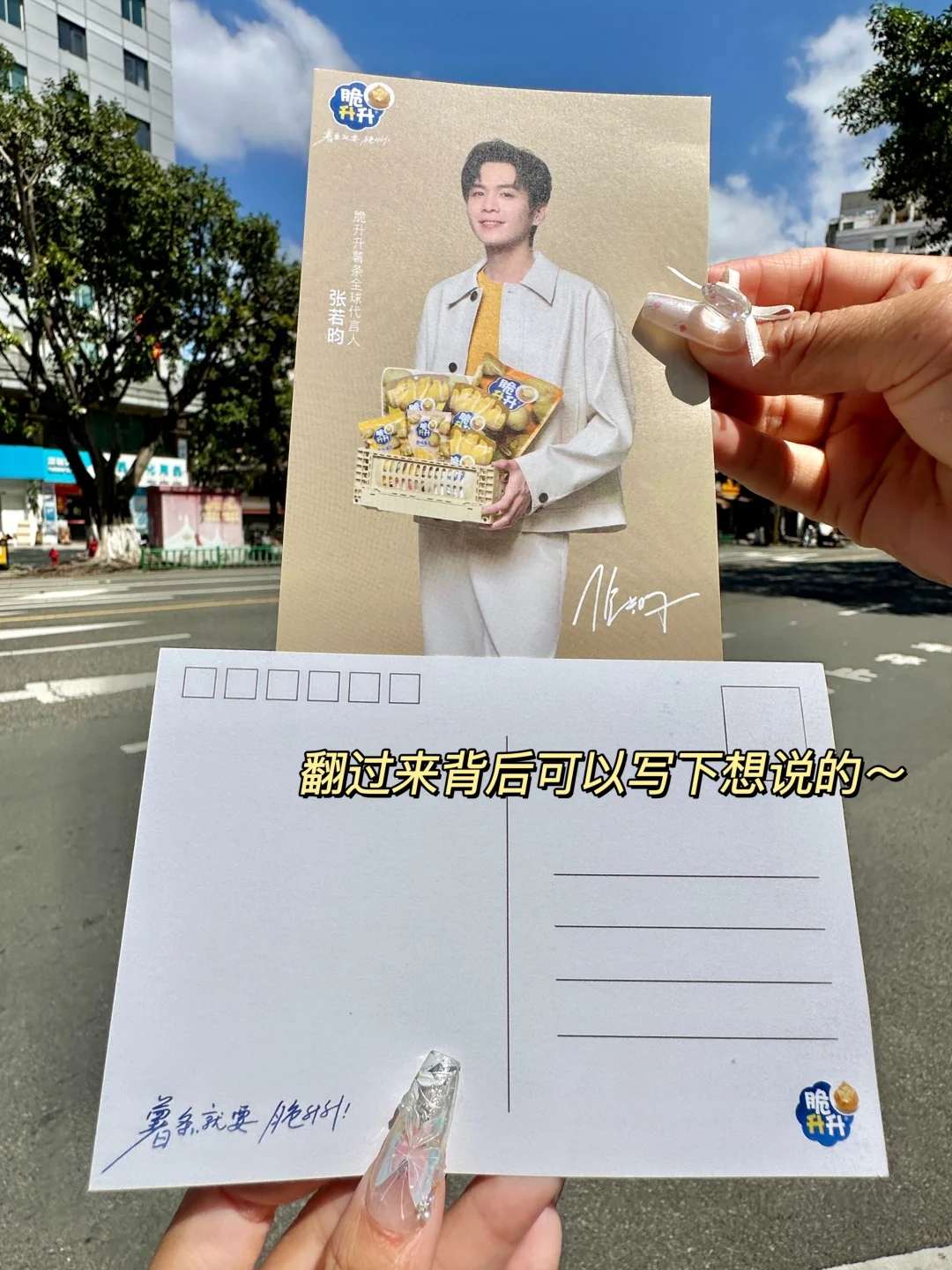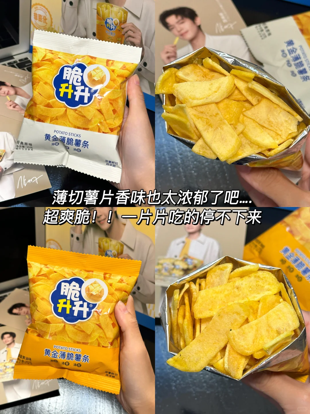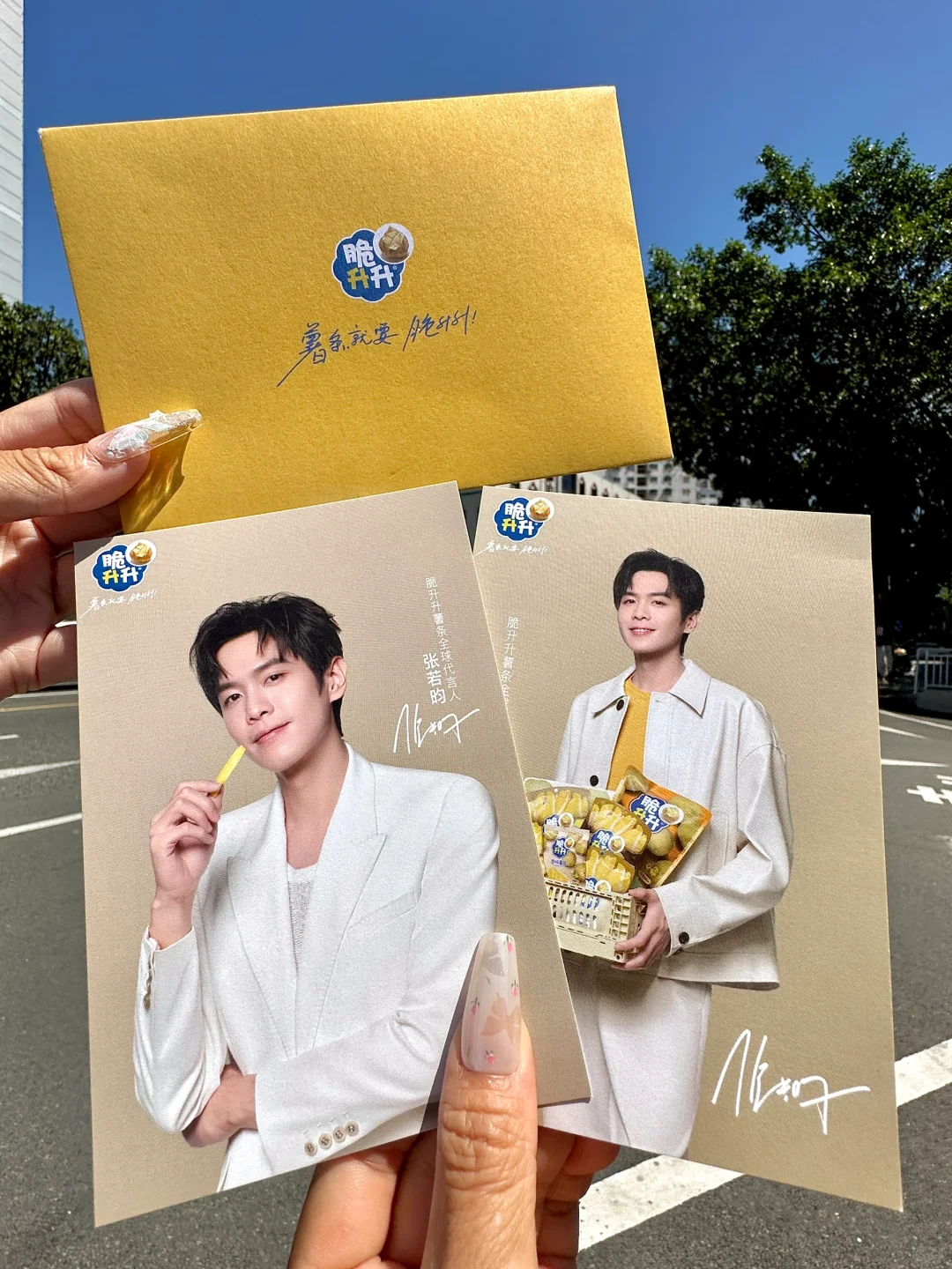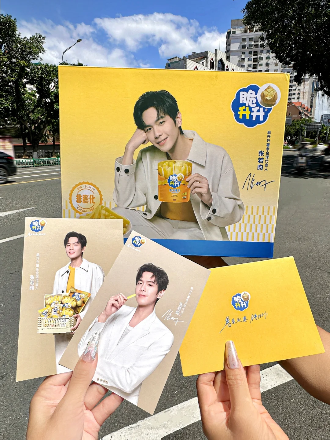 家人们谁懂啊!!要天天吃薯条了 脆升升居然和张若昀联动啦!直接入手代言人周边礼盒!!包装盒大屏美颜帅到我心坎上~舍不得丢掉啊啊啊… 周边明信片也太太太好看了!背后还可以🐴字写下想说的话~ 用信封✉️装着仪式感拉满!!! · 不得不说薯条也是真的好吃🥹 一箱足足十几包,热门和新品口味的组合装 薯条都是原薯鲜切的,不论是实心薯条还是薄切薯片都裹满了粉料,香味巨浓郁贼入味!! 蜂蜜黄油味!我永远的白月光!!! 甜滋滋的带着奶香味儿,特别好次😋😋吃完忍不住嗦半天手指啊!! 还有番茄味、炭烤和牛味和海盐柠檬味也好好吃啊! ·
